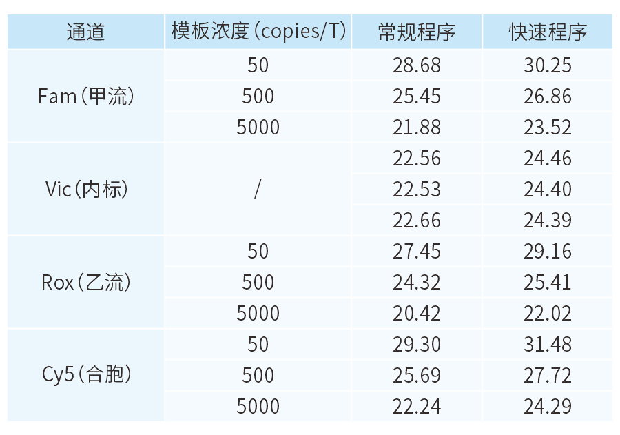 在呼吸道四重检测体系下,宝锐生物MD2104-X快速扩增试剂15min程序与常规程序相比Ct≤2,可正常检出靶标。