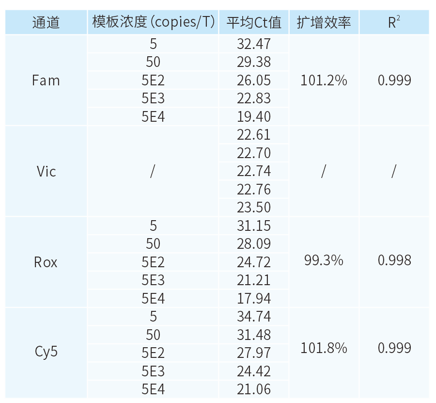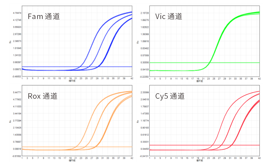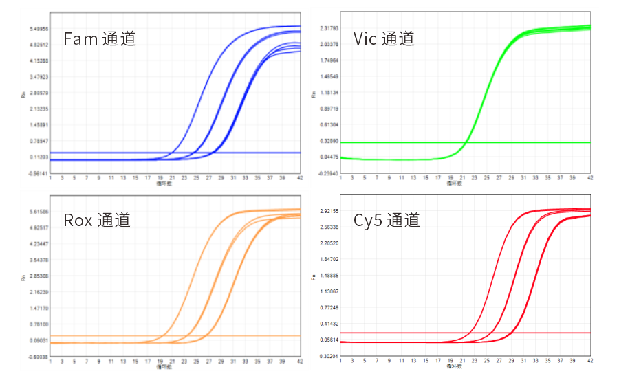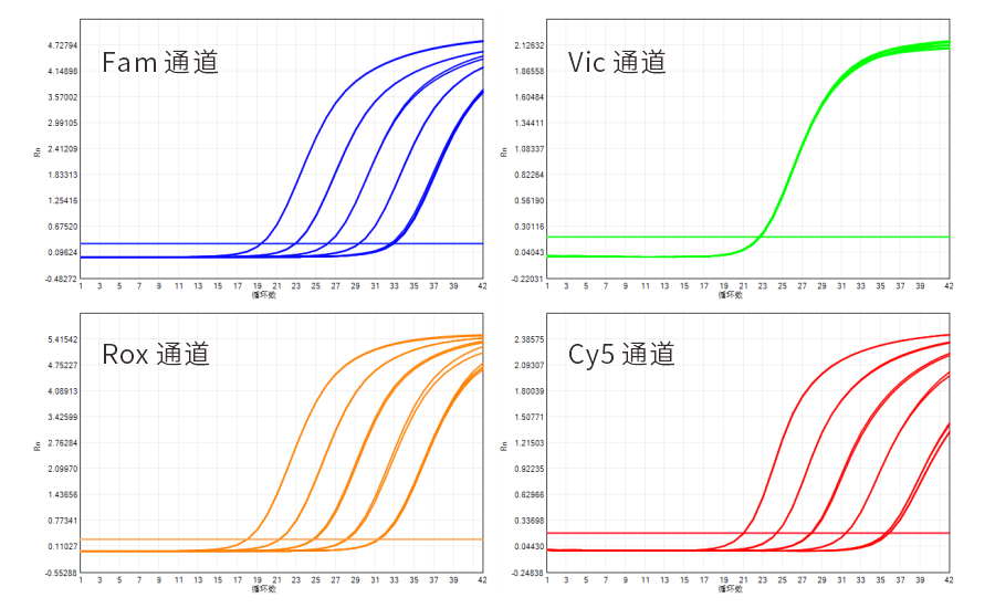 MD2104-X体系在呼吸道引探中扩增效率表现良好,各通道扩增效率均在95-105%之间,R2系数均在0.998-0.999。