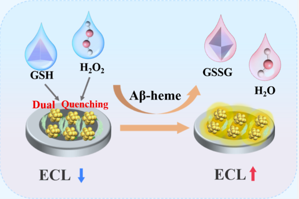 研究创新性地提出“双重猝灭—催化恢复”机制。利用Aβ40与血红素形成的复合物具有过氧化物酶样活性,可催化GSH与H₂O₂发生氧化还原反应,使两者相互消耗,从而解除对AuNCs-ECL信号的猝灭作用,实现信号“关-开”切换。