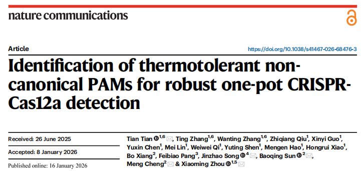 近日,一组来自华南师范大学及其他一些知名医院、机构合作在杂志Nature communications上发表了一篇题为“Identification of thermotolerant non-canonical PAMs for robust one-pot CRISPR-Cas12a detection”的文章。作者系统性探索了温度对CRISPR-Cas12a活性的影响,发现了一系列具有高热耐受性的非经典PAM,并开发了一种名为“POP-CRISPR”的一体化检测平台。该平台在核酸检测的灵敏度、特异性、速度和靶标适应性方面均实现了显著提升,并在人乳头瘤病毒、肺炎支原体及其耐药菌株的临床样本检测中得到了成功验证。POP-CRISPR 能够在 20 分钟内利用快速样本处理方案和微型检测设备实现现场快速病原体检测。
