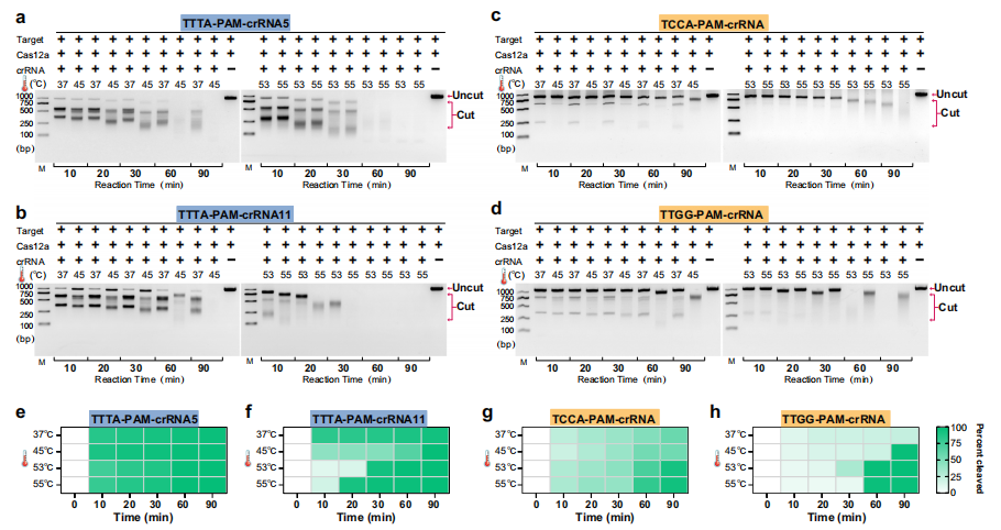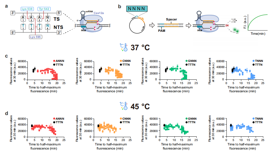 37°C和45°C时PAM介导的LbCas12a反式切割活性的综合评估。图片来源:Nature communications