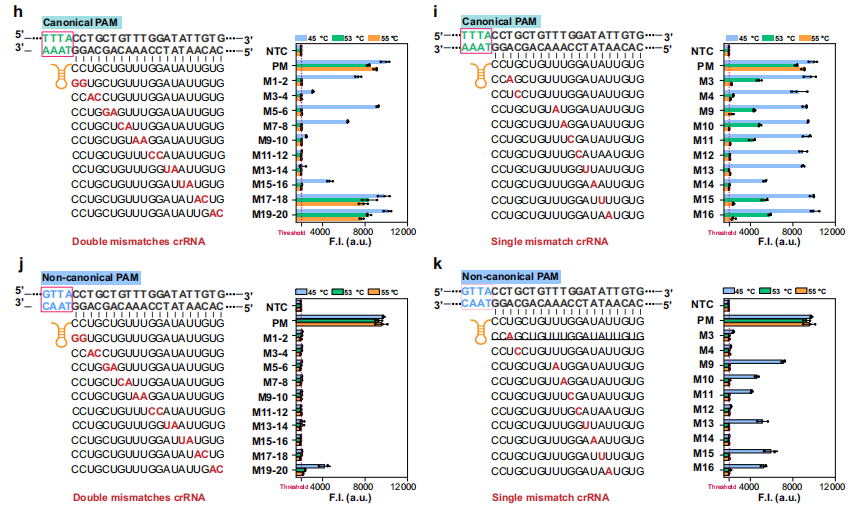 除了灵敏度,POP-CRISPR在检测特异性方面也展现了优势。对于经典PAM,在45°C时Cas12a仅对部分位置的双碱基错配敏感;当温度升至55°C时,所有测试的10个单碱基错配位点均导至检测信号完全丧失(图h、i)。对于非经典PAM,温度介导的错配敏感性更为显著,在53°C或55°C下,所有单碱基错配位点也表现出完全的错配识别敏感性(图 j、k)。