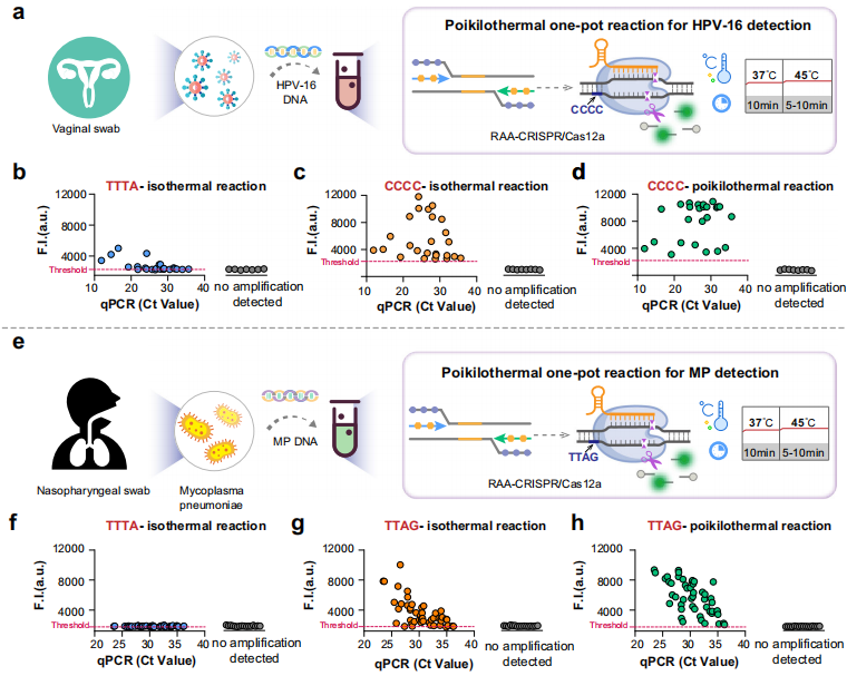 研究团队收集了33例疑似HPV-16感染的阴道拭子样本和65例疑似肺炎支原体(MP)感染的鼻咽拭子样本,对POP-CRISPR的临床性能进行了评估,并与标准PAM介导的方法以及基于sPAMC的方法进行了比较。结果显示,标准PAM介导的方法敏感性最差,对于HPV-16检测,POP-CRISPR成功检出25例阳性样本和7例阴性样本,与金标准qPCR结果完全一致,其信号噪比也优于sPAMC方法(图b - d)。对于MP检测,POP-CRISPR检出全部49例阳性样本和16例阴性样本,而sPAMC仅检出43例阳性(图f - h)。这表明POP-CRISPR在临床病原体检测,特别是在超低浓度样本检测中,具有更稳定、更可靠的性能。