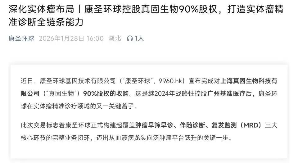 我们还是不够狠心” “骨折,必须骨折”这篇是纠错,纠我们自己的错,我们乐观的高看了行业洗牌局面下的企业价值。今年1月底,康圣环球宣布完成了对真固生物90%股权的收购。当时我们根据港交所的公告规则,推测交易金额不超过5500万人民币,对应真固的估值不超过6200万。而随着今天康圣环球的2025年业绩公告出炉,真相来了。不是6000万,不是5000万,没到4000万,也没有3000万.....康圣环球收购真固生物90%的股权仅用了2050万,对应真固的估值大约是2278万。朋友们,面对现实吧,这就是行业洗牌逻辑下的残酷现实:这种情况下的收购,估值体系就不是既往大家耳熟能详的PE、PS了,因为那都是基于“未来成长空间”的:不管是PS(市销率)还是PE(市盈率),本质都是对公司未来赚钱能力的折现。我自己从头注册一张你持有的三类证、并完成你现有的“额外”渠道铺设,需要花多少钱和多少时间?计算值(自建成本)<拟定收购金额,那毫不犹豫的自己干。最后,虽然真固的“落幕”并不光鲜,但我依然对这家公司怀有敬意:感谢真固在中国肿瘤NGS注册进化史上留下的那浓墨重彩的一笔:增加NRAS的注册变更,让中国肿瘤NGS的注册边界往前又迈进了一大步