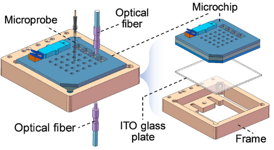 光吸收模块由紫外-可见连续复合光源、制冷光谱仪以及发射和接收光纤构成,光纤和芯片平面垂直,用透射方式对平面反应单元进行吸光度检测。