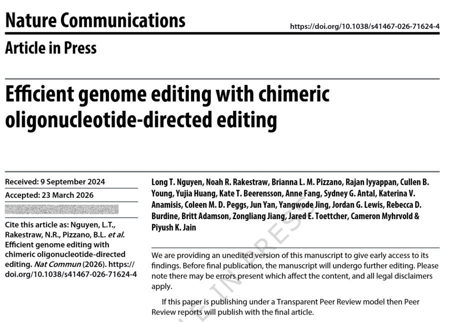 基因编辑领域再添重磅工具!近日,国际顶级期刊Nature Communications发表一项突破性研究,科学家成功开发出嵌合寡核苷酸定向编辑(CODE) 系统,打破传统先导编辑的技术瓶颈,以更简单的结构、更高的效率,实现无 DNA 双链断裂的精准基因组修改,为基因治疗、动物育种、疾病建模带来全新可能。