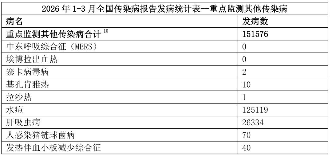 2026 年 1-3 月全国重点监测其他传染病的发病合计发病151576 例。水痘为绝对高发病种,报告 125119 例;其次为肝吸虫病 26334 例,两者为该类疾病的主要构成。低发 / 输入性疾病为发热伴血小板减少综合征、人感染猪链球菌病病例数较少;寨卡病毒病、基孔肯雅热、拉沙热仅为零星个例报告。零发病种:中东呼吸综合征(MERS)、埃博拉出血热报告数为 0,烈性境外传染病无输入流行迹象。
