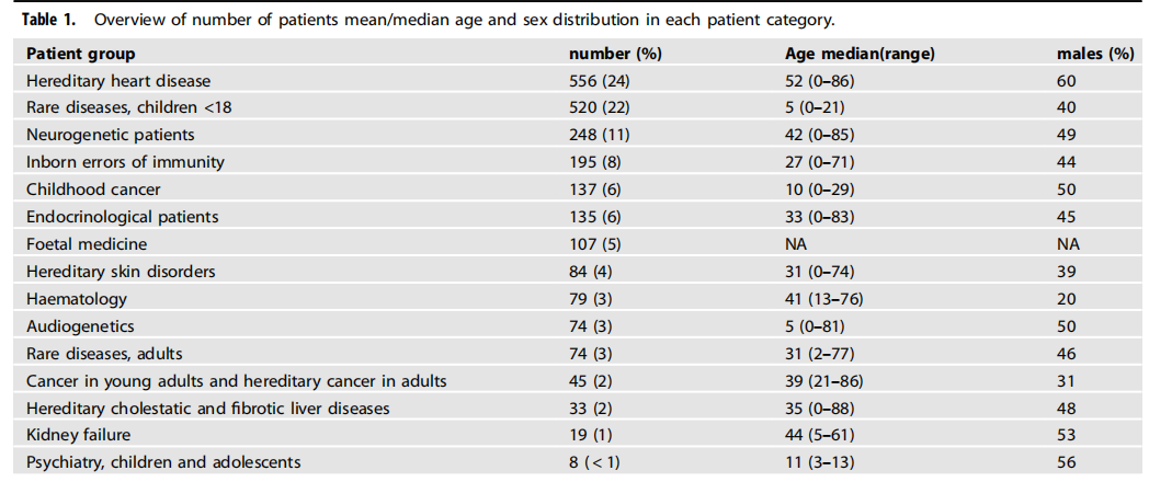 本研究基于丹麦国家基因组中心(DNGC)建设过程中的实施项目,建立了由临床医生、临床实验室专家、由丹麦医学协会组织任命的代表以及患者组织组成的全国专家网络,以指导全基因组测序的实施。全基因组测序的患者群体选择涉及了18个患者类别,时间跨度为45个月,最终对2317名患者完成了srWGS并出具临床报告。患者覆盖了心血管、儿科罕见病、神经遗传病、免疫缺陷、内分泌、胎儿医学、皮肤遗传病、听力遗传病等多个方向(如下图)。所有检测均在认证实验室完成,分析流程涵盖SNV/小InDel识别,也逐步纳入结构变异、重复扩增及SMN1/SMN2拷贝数分析等能力。