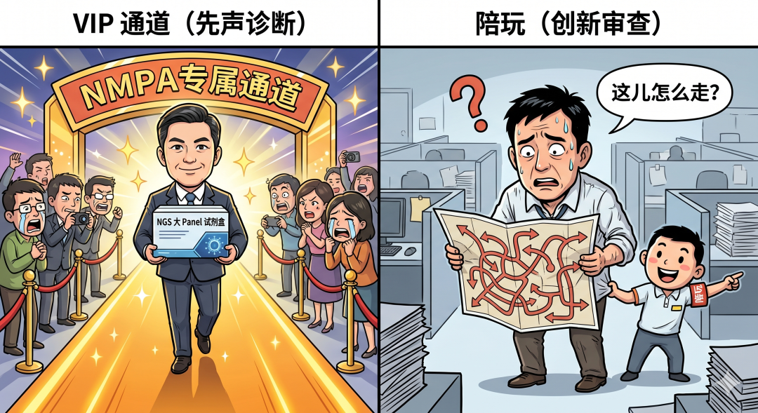 京圈的京,是南京的京” “皇冠上的明珠,被两波人同时盯上了”肿瘤NGS大panel,指的是一个注册证上“有一级变异”、“可报告二级变异”、且“技术要求中包含三级变异”的肿瘤NGS试剂盒。这就是大panel的定义,这个定义如果不小心伤害到了谁,现在关掉这篇文章还来得及。正因为这个苛刻的定义,大panel从一开始就被视为肿瘤NGS注册的珠穆朗玛峰。PS:这篇仅代表个人观点。如果我俩理解不一样,那么你是对的。欢迎留言区探讨。昨天,CMDE公示了2026年第十一批“医疗器械优先审批申请审核结果”。先声诊断的“人类多基因联合检测试剂盒(可逆末端终止测序法)”上榜!跟我们这个赛道有关系的是「(一)2、(一)5、(二)」这三条。「(一)5」一般属于“之前没有被注册过的、新的伴随诊断变异”,是一个first in class。比如年初进入优先审批通道的燃石乳腺癌CDx(PIK3CA/PTEN/AKT1)和吉因加胆管癌CDx(FGFR 1/2/3)。「(一)2」则属于“虽然没有新的伴随诊断变异”,但是在产品形态或者排列组合上玩出了新花样,是一个me better。先声诊断这次进入优先审批的就是个大panel,100%确定。但亲戚和克隆是两码事,美帝的Kit和东大的Kit也可能并不一样,所以:1. 下证的版本会有500+基因吗(一级+二级+三级)?2. CDx label能超过2个吗?会是泛实体瘤吗?这个感觉有难度,NTRK 1/2/3被世和几乎垄断了5. 会有TMB吗?如果有的话,会是一级变异还是二级变异?这可能取决于KN035那个TMB-H适应症能否获批。“医疗器械优先审批程序”和“创新医疗器械特别审查程序”,有什么差异?创新审查程序重在“全程辅导”,就像大家出去玩时找的陪玩。代表产品还没递交注册申请,对于某些挑战特别大的品种,甚至可能注册临床试验的方案都还没定。优先审批程序则是“加速通道”,就像很多景点的VIP专属通道。代表产品的注册临床试验已经做完了,正式递交了注册申请。历史的经验显示,进入优先审批程序后,拿证的周期大约在12-18个月。先声好事将近,谁最着急?每次聊NGS大panel的话题,我在世和的朋友们就会表示不开心。在世和眼里,自己的TMB是基于检测425个基因算出来的,这就是个大panel。在我眼里,一个没有一级变异、没有二级变异的试剂盒, 连个正经小panel都不算。先声已经拿到了优先审批,到时候下证了肯定会疯狂宣传“真正的NGS大panel第一证”,那可就太难受了。世和,迫切的想要保卫住自己的“大panel第一证”名号。而保卫的最好办法,就是把它真正的变成大panel。本来我是不知道的,直到昨天晚上,我梦到了一只狐狸。它说我早八辈子在雪山上救了它,现在它来还愿,让我说出一个愿望。我说我想知道世和有没有在尝试扩展TMB试剂盒的预期用途。世和已经/计划启动临床试验,目标是对获批的“非小细胞肺癌组织TMB检测试剂盒”的预期用途进行变更。一级变异:肺癌增加ALK/MET/EGFR,肠癌增加KRAS,胃癌/乳腺癌增加ERBB2扩增,泛实体瘤增加NTRK1/2/3。二级变异:肺癌14个、肠癌12个、胃癌9个、乳腺癌11个、泛实体瘤4个。如果去看历史上出台的审评指导原则,它们都有一个共性:而他们探路的过程,会被总结成经验,成为审评指导原则。所以大家觉得京圈双雄谁能率先拿到真正的大panel第一证?(选偷家的朋友们,留言区说说谁偷家?)