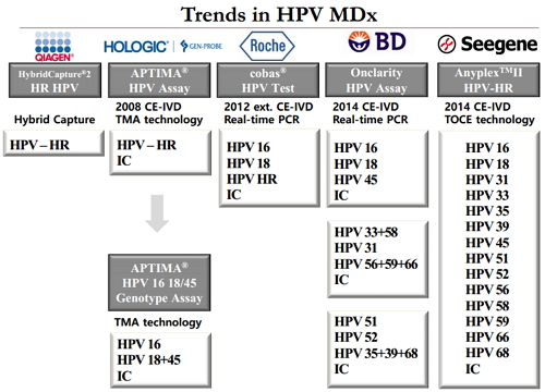 HPV分子诊断趋势(图片来源:Dave(Dae Hoon) Lee演讲PPT) 高度多重通道的real-time PCR技术,一旦成功,该技术能够在一次试验中,完成单一样品中的10种以上的微生物的快速测定和区分。 Seegene是一家跨国公司,致力于开发多重分子技术和多重临床分子诊断产品,这类产品能同时检测多个靶体,且灵敏度、特异性和可重复性都较高。该公司的产品检测多个病原体可靠性高,通量高,最终为节省时间、人力和费用奠定经济基础。 Seegene公司的核心关键技术ACP,DPO,READ和TOCE等,能够保证M-MoDX测试在同时测定多重靶点的时候,具有高度的敏感性、特异性和重复性。Seegene的产品在检测多数病原体时具有极大的可靠性和生产力,能够提供最经济的时间、人力成本。Seegene的目标是在使用分子诊断技术,在传染病、遗传学、遗传病理学和使用革新技术的肿瘤学领域中占据领导地位。 |