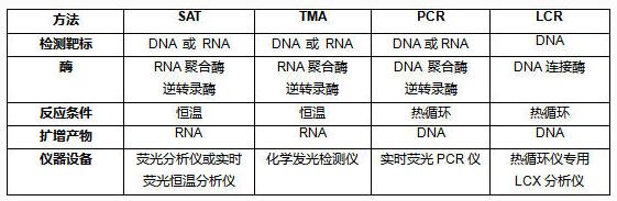 带有T7启动子的引物与靶标RNA结合,开始逆转录合成cDNA;在M-MLV RT酶的RNase H活性作用下靶标RNA链降解,形成单链cDNA;之后反向引物与cDNA结合,在M-MLV RT酶的聚合酶活性作用下产生靶标核酸(RNA)的一个双链DNA拷贝,且该双链带有T7启动子。在T7 RNA聚合酶的作用下,一条DNA双链上产生多个(100~1000个)RNA拷贝;每一个RNA拷贝再从反转录开始进入下一个扩增循环;同时,带有荧光标记的探针和这些RNA拷贝特异结合,产生荧光。该荧光信号可由荧光检测仪器实时捕获,直观反映扩增循环情况,整个扩增过程都在同一温度(42°C)下进行。 下表列出了SAT同目前常见的其他几种核酸扩增检测技术在检测靶标、酶、反应条件、扩增产物及仪器设备等方面的比较: SAT与各种核酸扩增检测技术对比表