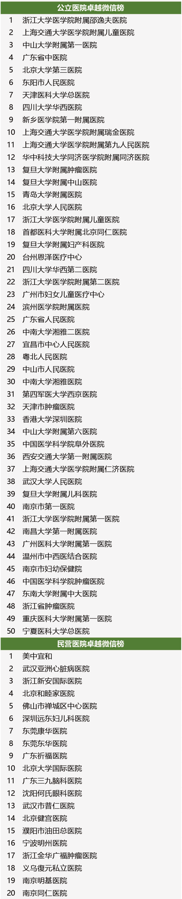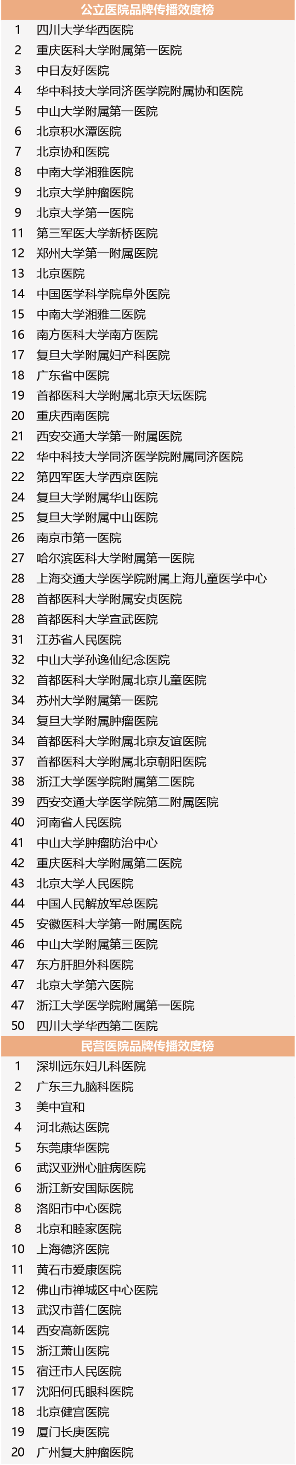 新媒体的强势崛起对医疗行业产生了巨大的影响,短短数年,不论是公立医院还是民营医院,大家都纷纷意识到医院品牌传播的力量。微信微博、舆情监测、健康科普等一个不落,一些医院品牌正在冉冉升起。 2016年4月,丁香园携手新榜共同发布「2015医院品牌传播百强榜」,凭借丁香园16年的行业经验和新榜在新媒体数据及算法的积累,为全行业盘点新媒体时代成功铸造医院品牌的王者之师。本届榜单分为总榜:2015医院品牌传播百强榜及四大子榜:2015年度医院卓越微信榜,2015年度医院微博影响力榜,2015年度医院品牌网络热度榜,2015年度医院品牌传播效度榜。 同期,丁香园将在2016年4月13-16日,于杭州举办「2016中国医疗行业品牌传播高峰论坛」,本次峰会看点之一就是医院品牌传播百强榜的颁奖典礼,如果您想了解更多关于榜单背后的故事,敬请关注我们的高峰论坛,点击了解会议详情。 在品牌传播综合实力的较量上,四川大学华西医院、北京协和医院及北京大学第三医院斩获公立医院品牌传播的前三甲。而再看民营及外资医院,美中宜和、深圳远东妇儿医院、武汉亚洲心脏病医院分列冠亚季军。