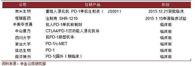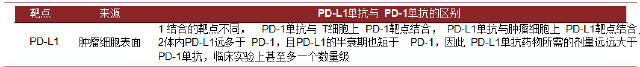PD-1/PD-L1单抗区别 PD-L1单抗在研情况 截至目前,还没有PD-L1单抗药品获批上市。罗氏、阿斯利康等均有在研产品。罗氏的抗PD-L1治疗药物MPDL3280A(atezolizumab)被FDA授予突破性治疗药物资格,用于某些非小细胞肺癌和转移性膀胱癌。 阿斯利康的PD-L1单抗药物MEDI-4736目前正在进行III期肺癌和 II期结直肠癌研究。国内方面,君实生物和百济神州除了在进行 PD-1单抗的研发,也正进行着PD-L1单抗的临床前研究。