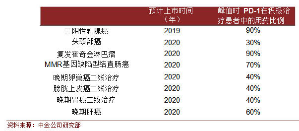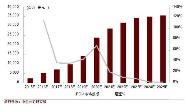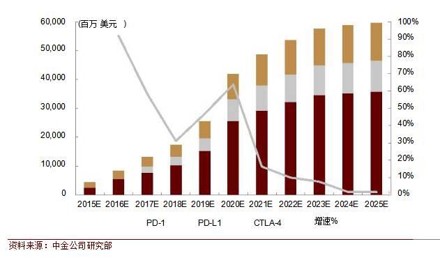 肿瘤免疫治疗原理是应用免疫学的方法,提高肿瘤细胞的免疫原性,激发和增强机体抗肿瘤免疫应答,从而抑制肿瘤生长。肿瘤免疫治疗有望成为继手术、化疗、放疗和靶向治疗后,肿瘤治疗领域的一场革新。 肿瘤免疫治疗的热门靶点包括 PD-1,PD-L1,CTLA-4。2011年CTLA-4单抗 Yervoy被美国 FDA批准用于晚期黑色素瘤的二线治疗,标志着肿瘤免疫治疗时代到来。 2014年底和2015年,PD-1单抗陆续获批用于黑色素瘤、非小细胞肺癌和肾癌治疗,将免疫治疗推向肿瘤治疗的高峰。未来,伴随新适应症获批和PD-L1单抗的研发推进,肿瘤免疫治疗将占据肿瘤治疗的半壁江山。 600亿美元市场空间 目前,PD-1药物在黑色素瘤、非小细胞肺癌、肾癌领域已经获批,其他适应症的临床试验正在进行中。预计 2025 年,PD-1 单抗市场规模将达到358亿美元。PD-L1目前未有产品上市,预计上市后市场规模约为 PD-1单抗市场规模的30%。 到2025 年,PD-L1 的市场规模将达107亿美元。CTLA-4单药和联合PD-1治疗肿瘤也取得了不错的临床效果,预计CTLA-4 的销量为PD-1销量的 37%。到2025 年,CTLA-4单抗药物的销售额将达133亿美元。至2025年,三种靶向药物全部市场规模有望达598亿美元。