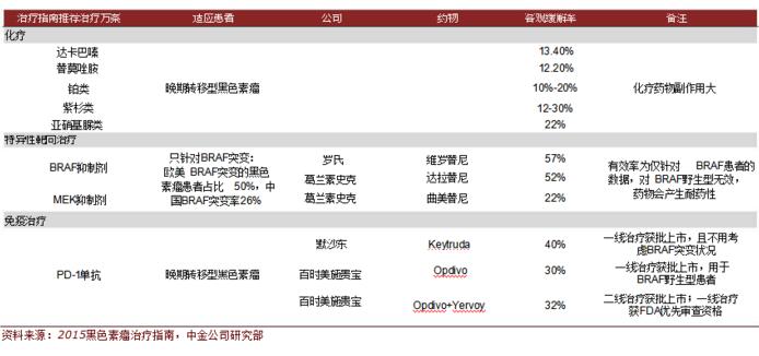 晚期黑色素瘤一线治疗不同的方案临床数据对比 PD-1联用——免疫鸡尾酒疗法引爆行业增长点 PD-1抑制剂是抗癌药的颠覆性产品,其单药有效性已经在黑色素瘤、非小细胞肺癌、肾癌等方面得到试验证实,特别在 PD-L1阳性患者上获得较高的应答率。最好的出路是与其他免疫靶点药物结合使用,多管齐下增强免疫疗法的效果。 PD-1与CTLA-4 联用。百时美施贵宝的药品组合Opdivo+Yervoy,二、三线治疗具有特定突变的黑色素瘤已获批上市,一线治疗晚期黑色素瘤和非小细胞肺癌有望分别于2016年、2019年获批上市。 PD-1与利妥昔单抗联用。CureTech和Teva公司合作研发的新药pidilizumab(PD-1单抗)联合利妥昔对 B细胞淋巴瘤和滤泡细胞淋巴瘤有效。在一项Ⅱ期临床试验中,pidilizumab联合利妥昔单抗治疗复发性滤泡状淋巴瘤也取得疗效。 PD-1与IDO抑制剂联用。Incyte公司的IDO抑制剂Epacadostat和默沙东PD-1单抗 Keytruda联合使用在一个早期临床试验中显示良好的疗效和安全性。PD-1与 T-vec联用。 安进与默沙东于2014年12月签署免疫肿瘤学战略合作,推动癌症疫苗 T-vec与PD-1免疫疗法 Keytruda联合用于晚期黑色素瘤的治疗。2015年6月,双方扩大合作,将该免疫鸡尾酒用于复发性或转移性头颈部鳞状细胞癌的治疗,同时启动该免疫鸡尾酒治疗晚期黑色素瘤的III期临床研究。 PD-1与CCR4单抗联用。2014年12月,百时美施贵宝与日本小野制药、协和发酵麒麟达成临床试验合作协议,计划开展一项 I期临床试验,推进Opdivo和抗CCR4单抗mogamulizumab 组合疗法,用于治疗晚期或转移性实体瘤的安全性、耐受性和抗肿瘤活性。