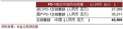 其他适应症选择 PD-1的治疗比例 中国PD-1单抗市场规模 峰值时中国PD-1市场规模625亿人民币,国产PD-1规模352亿人民币。目前还没有PD-1单抗的药物进入中国市场,Opdivo药物已经拿到国内三期临床批文,君实生物获得国内临床批文。 预计PD-1在中国的销售峰值为625亿人民币,其中进口药物273亿人民币,国产药物352亿人民币。PD-1销售峰值中国市场规模预计基本假设: 1、选择PD-1国产药物与进口药物的患者人数比例为 8:2; 2、中国患者选择用 PD-1治疗黑色素瘤、肾癌、三阴性乳腺癌、头颈部癌、复发霍奇金淋巴瘤、MMR基因缺陷型结直肠癌、晚期卵巢癌、膀胱上皮癌、晚期胃癌、晚期肝癌适应症的比例与美国相同; 3、所有适应症的积极治疗渗透率为 70%; 4、一线治疗非小细胞肺癌患者中,选择PD-1比例为 20%,低于美国的一线 PD-1比例30%(亚洲 EGFR敏感者占50%,欧美仅为 10%,中国患者更适合 EGFR-TKI类药物); 5、进展到二线治疗的晚期非小细胞肺癌比例为60%,二线治疗患者中,选择PD-1比例为40%; 6、中国患者PD-1平均治疗时间与美国相同; 7、预计进口PD-1在中国实际负担售价为56 万人民币/年(美国售价约为15万美元/年,假设进口厂商考虑当地支付能力的基础上利用赠药等机制将售价定为国际市场的 60%);保守估计国产PD-1单抗价格为进口药物的1/3,为18万人民币/年。