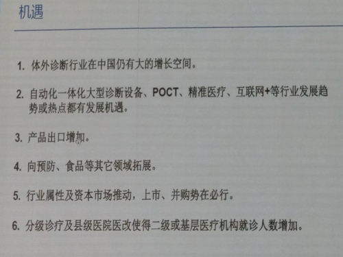 ![]() 朱耀毅,复星医药副总裁兼医学诊断事业部董事长 体外诊断(IVD)被业内形容为“正在崛起的朝阳产业”。2016年6月29日,第三届中国IVD产业投资与并购CEO论坛在美丽富饶的钱塘江畔、充满活力的下沙新城召开。本届大会由包括来自产业界、投资界和其他专业领域的超过300人的嘉宾参与,是三届以来规模最大的一次。来自复星医药副总裁兼医学诊断事业部董事长朱耀毅以《中国体外诊断行业年度报告(2015年)》为契机,为与会者做了《中国体外诊断行业进展及前景展望》。 据日前由全国卫生产业企业管理协会医学检验产业分会、中国医疗器械行业协会体外诊断分会联合发布的《中国体外诊断行业年度报告(2015年)》分析:目前,国际IVD巨头已进入国内市场,国内企业也已形成相对稳定的发展格局。结合国家相关产业政策分析,预计未来一年国内IVD行业仍将平稳增长。 ![]() 一、政策与环境 2015年是医药卫生及相关政策发布较多的一年。这些政策与环境的变化推动了体外诊断行业的发展,促使行业企业管理更加规范和自律,提升企业创新能力,对整个行业有积极与深远的影响。下面把这一年主要政策按时间顺序由近到远梳理如下: ![]() 1、加快新增医疗服务价格项目受理审核 12月25日,国家发改委为贯彻落实《中共中央国务院关于推进价格机制改革的若干意见》精神,改进各地对新增医疗服务价格项目的管理,鼓励研发创新,促进医疗新技术及时进入临床使用,营造大众创业、万众创新良好环境,加快新增医疗服务价格项目受理审核工作。 各地受理新增医疗服务价格项目,不受《全国医疗服务价格项目规范(2012年版)》限制。对涉及试剂、耗材和设备等医用产品的项目,只要相关产品获得有关部门批准生产、具备市场准入条件,均应纳入新增医疗服务价格项目受理范围。 对有关单位报送的新增医疗服务价格项目,各地要及时受理,高效办理。要进一步简化工作程序,按照鼓励创新和使用适宜技术相结合的原则加快审核,及时公布审核结果。 对审核通过的新增医疗服务价格项目,各地要明文规定在本行政区域内执行,并明确项目编码、项目名称、项目内涵、价格水平或价格管理形式等。 各地不得以任何名义和方式,拒绝或推诿新增医疗服务价格项目的受理审核工作。 2、控制公立医院医疗费用 11月6日,卫计委等5部门发文《关于控制公立医院医疗费用不合理增长的若干意见》。文中指出随着社会经济发展,医疗卫生事业进入快速发展阶段,医疗费用上涨较快。同时,医药费用结构和增长情况也存在不合理因素要进行控制,包括城市公立医院的费用在医药费用总量中占比较大,药品、大型医用设备检查治疗和医用耗材收入占比较高等。 今后,公立医院的医疗费用控制情况将与公立医院等级评审准入、财政拨款预算安排、院长年度绩效考核、医务人员的评优绩效工资分配等方面的绩效考核评价挂钩。 3、健康中国是“十三五”时期卫生计生事业发展的总体规划 10月29日,“健康中国”被写入中共十八届五中全会《中共中央关于制定国民经济和社会发展第十三个五年规划的建议》公报。今年9月初,国家卫计委已全面启动《健康中国建设规划(2016-2020年)》编制工作。 推进健康中国建设,深化医药卫生体制改革,理顺药品价格,实行医疗、医保、医药联动,建立覆盖城乡的基本医疗卫生制度和现代医院管理制度,实施食品安全战略。促进人口均衡发展,完善人口发展战略,全面实施一对夫妇可生育两个孩子政策,积极开展应对人口老龄化行动。预计全面放开二胎政策带来300-500万年新增人口,短期人口增量可能会在未来5年释放,共计1500-2500万人口。 4、医疗服务价格改革意见指出要降低部分检验检查价格 10月21日,国家发改委表示,医疗服务价格改革指导意见已完成初稿,目前正在征求意见过程中。 近年来,国家发改委会同有关部门加大了医疗服务价格改革的力度。统一规范医疗服务价格项目,开展按病种、按服务单元等收费方式改革试点,特别是指导地方配合公立医院改革,通过取消药品加成及降低药占比、降低部分检验检查价格、调整医疗服务价格、落实政府办医责任等综合措施和联动政策,也促进了医疗机构新型补偿机制的建立。部分医疗服务价格可由医疗机构自主定价。 医疗服务价格改革强化价格、医保、医疗等相关政策衔接,一是与充分发挥医保控费作用相结合;二是与建立科学补偿机制相结合;三是与减轻患者负担相结合。确保医疗机构良性运行、医保基金可承受、群众负担不增加。 5、健全分级诊疗体系、加强全科医生培养,推动医师自由执业 9月11日,国务院公布《关于推进分级诊疗制度建设的指导意见》。意见讲到目前正在努力通过各种各样的政策、措施和工作,增加建立分级诊疗制度的落实。实施基层首诊、双向转诊、急慢分治、上下联动的分级诊疗模式。 到2017年,分级诊疗政策体系逐步完善,医疗卫生机构分工协作基本形成,基本建立符合国情的分级诊疗制度。到2020年,分级诊疗服务能力全面提升,保障机制逐步健全,形成布局合理、规模适当、层级优化、职责明晰、功能完善、富有效率的医疗服务体系基本构建。 6、互联网+医疗会对行业有长远影响 6月24日,国务院常务会议通过《“互联网+”行动指导意见》部署,推进“互联网+”行动。在国家大力