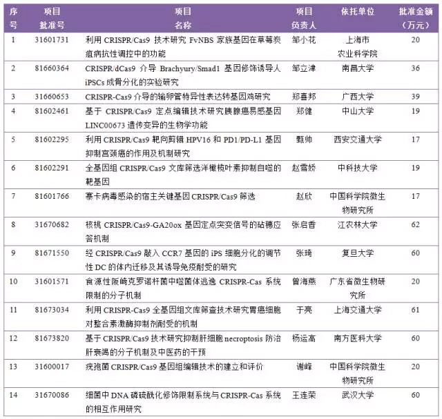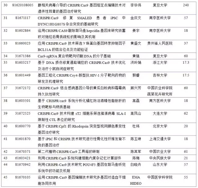 由此看来,医学科学部投入资源最多,数量和金额均超过20%。而管理科学部的项目数量和金额均垫底,占比分别为4%和3%,约为其他学部项目平均数量和平均金额的29%和21%,同时其单一项目平均赞助额亦为最低,由于自然科学基金的主要资助对象是自然科学研究,而管理科学部的社会科学属性突出,故受此冷落。 另数据显示,2016年获资助的基因编辑CRISPR技术相关项目共计80个,总金额超过3200万元。其中,获批金额最高的项目是复旦大学李华伟教授主导的“腺相关病毒介导的CRISPR/Cas9基因组定点编辑技术对遗传性耳聋的基因治疗研究”,资助金额为240万元。