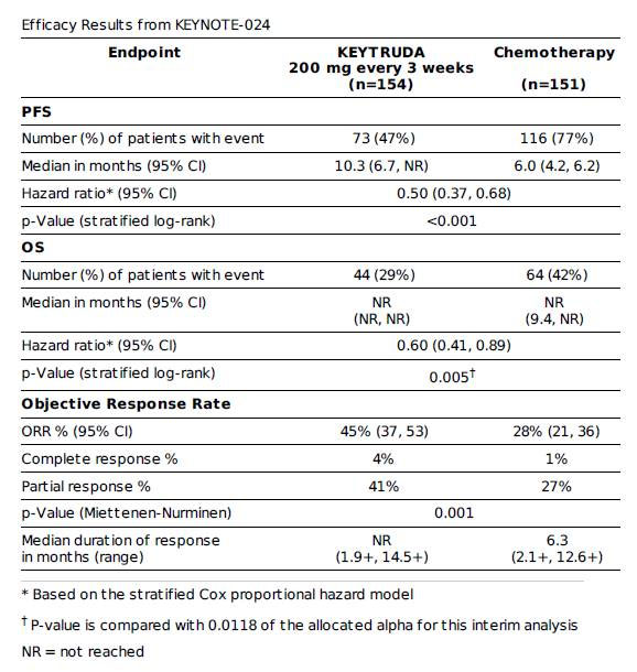 KEYNOTE-024的优秀临床试验数据(图片来源:默沙东官网) 本次FDA批准KEYTRUDA上市是基于KEYNOTE-024的优秀临床试验数据。在这项随机、公开标注的3期临床试验中,研究人员检验了KEYTRUDA作为单一疗法治疗非小细胞肺癌初治患者的疗效,这些患者的PD-L1表达量都超过了50%。与标准的含铂化疗相比,使用KEYTRUDA的患者其无进展生存期(HR, 0.50 [95% CI, 0.37, 0.68]; p<0.001)与总体生存率(HR, 0.60 [95% CI, 0.41, 0.89]; p=0.005)都得到了显着的改善,分别抵达了主要与次要临床终点。因此,这项试验也在今年6月提前终止,让化疗组的患者能够第一时间接受KEYTRUDA的治疗。