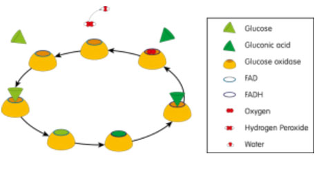 2015年7月,Noviosense联合美国梅奥诊所、德国弗劳恩霍夫(Fraunhofer)研究所、NFC技术的长期支持者移动医疗专家Gentag建立一个合资企业,想要开发一个能够取代传统的血糖仪、探索基于智能手机系统的胰岛素给药的系统管理。这个系统的核心就是这个小棍。 NovioSense利用由德国杜伊斯堡的研究所和NovioSense联合开发低功耗和高度敏感的ASIC技术检测泪糖。细看这个小棍,你会发现它是由三根导线围绕一个微电化学电池构成的。首先是绿色的导线是工作电极,表面涂有固化酶,这种酶可以将泪液中的葡萄糖转为葡萄糖酸,而固化酶表面的FAD和葡萄糖里的电子和氢结合,变成具有还原性质的FADH2。