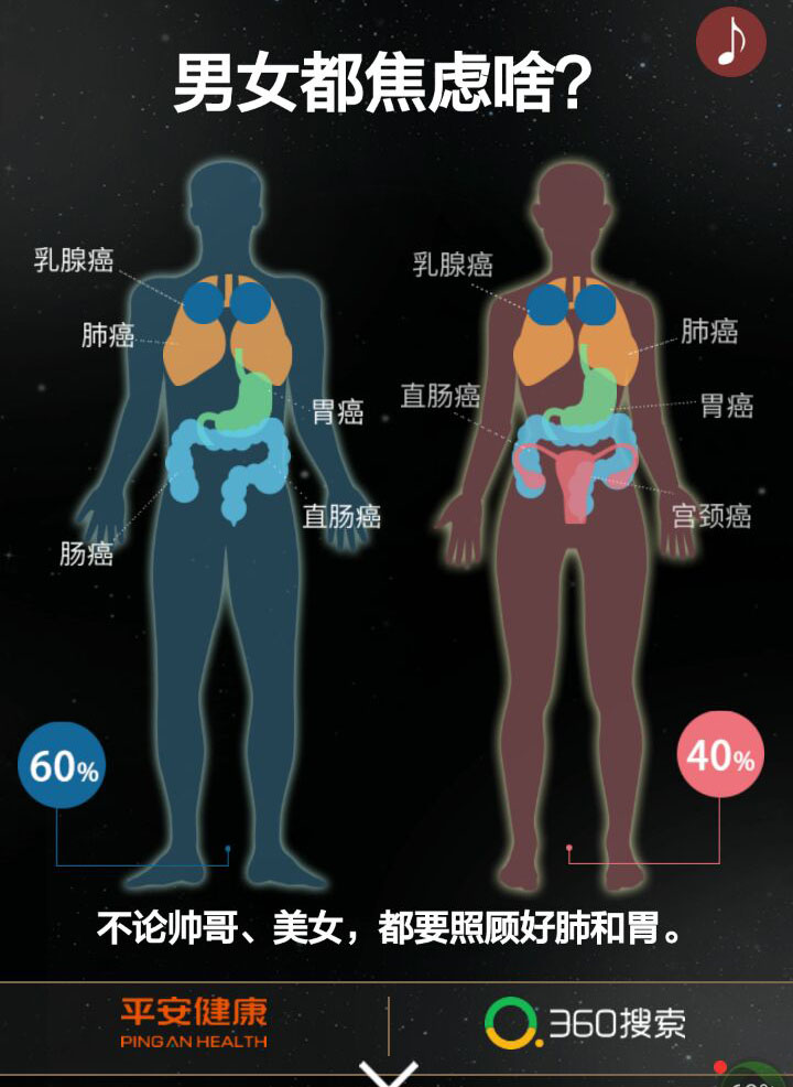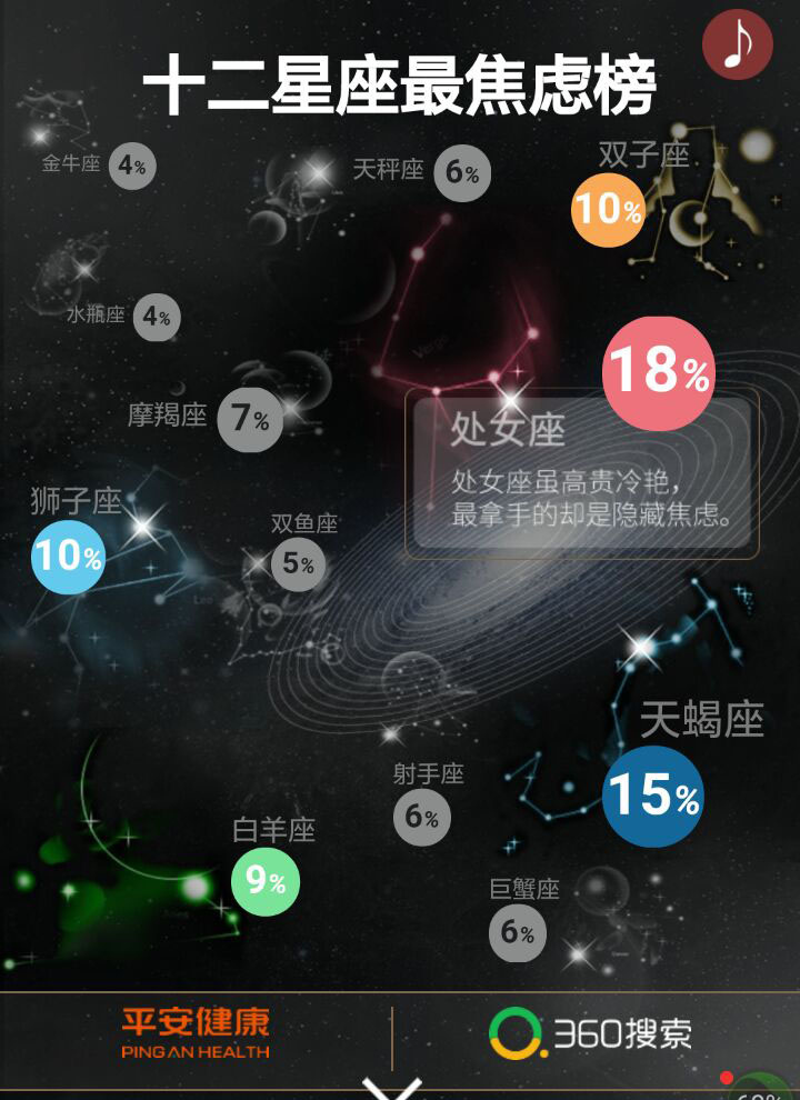 日前,360搜索联合中国平安健康险联合发布中国“癌症焦虑”大数据报告。报告不仅包含焦虑内容、年龄分布、地域分布等常规内容,还加入了星座分布、学历分布、致癌原因等年轻人衷爱的角度,方便用户从更多元的角度关注癌症人群。 以星座为例,报告显示十二星座焦虑榜前四名中土火风水四象兼备,其中,最焦虑罹患癌症的星座是处女座,虽然外表高贵冷艳,内心深处却深藏着对疾病的焦虑。排在第二位的是天蝎座,这可能与他们苦与乐都深埋内心,自己一个人苦的性格有关。傲娇的狮子座、分裂的双子座、孩子气的白羊座几乎并列第三,看来他们开朗乐观的外表只是伪装,灿烂笑容背后是一颗易碎的玻璃心。而反观淡定理性、天生乐天派的水瓶座,则对癌症表现出了“漠不关心”的态度,焦虑占比甚至比率性洒脱的射手座还要低上2个百分点。 虽然说男女有别,但是对于癌症的担忧,大家却有相通之处。报告显示男性焦虑的癌症包括肺癌、胃癌、肠癌等,女性则多了宫颈癌。看来,不论帅哥美女,大家对自己的肺和胃还是都比较关注的。这可能也和这些年空气质量不好外加“吃货横行”有关。 从致癌原因来看,食品安全和空气质量成为公认的主要原因,真的是“一杯牛奶会让人三思而后饮,室内装修也叫人费尽心思”。此外,爱美一族护肤品滥用,买醉一族饮酒过量,都可能让身体承担患癌的风险。 综合报告内容,读者可以从多方位多角度审视癌症,毕竟健康是人生最大的财富。或许看过这个报告后,我们都可以重新审视自己,关爱自己和家人的健康,从身边点点滴滴的小细节做起。