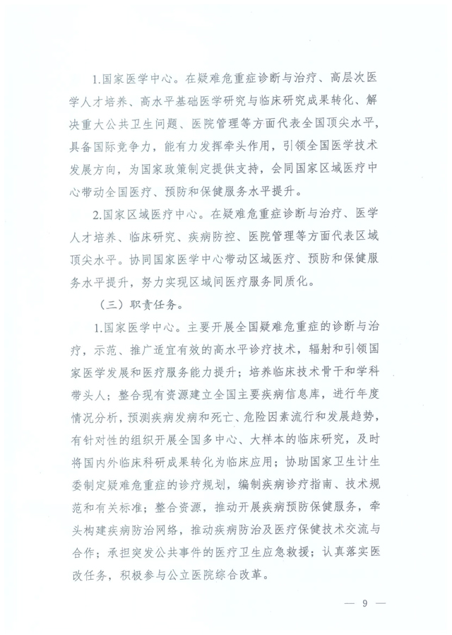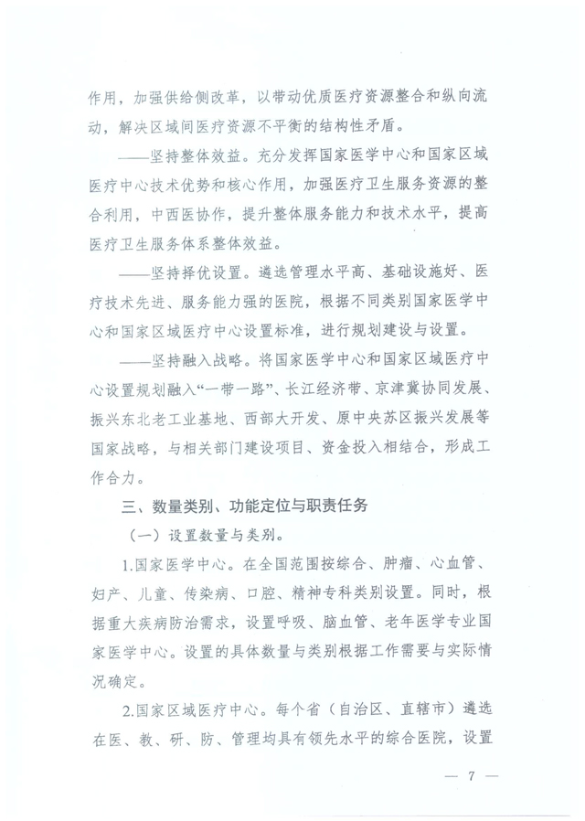 据国家卫生计生委医政管理局官网消息,2017年1月22日,国家卫生计生委印发《“十三五”国家医学中心及国家区域医疗中心设置规划》(国卫医发〔2017〕3号,以下简称《规划》),启动国家医学中心和国家区域医疗中心规划设置工作。此前,2016年7月,国家卫生计生委办公厅曾印发《关于国家儿童医学中心及国家儿童区域医疗中心设置规划的通知》(以下简称《国家儿童医学中心规划》),明确国家儿童医学中心由国家卫生计生委依照国家儿童医学中心设置标准,统筹考虑全国儿科医疗资源情况进行设置,同时要求各省级卫生计生行政部门于10月1日前将国家儿童区域医疗中心建设方案和主体医院2010-2015年相关数据(对照设置标准)报送国家卫计委。因此,此次发布的的《规划》可看做《国家儿童医学中心规划》的升级版。 为什么要出台《规划》 根据国家卫生计生委的官方解读,随着医改不断向纵深推进,我国医疗服务体系不断完善,医疗服务水平实现较快提升。但是,伴随老龄化、城镇化等社会经济转型过程,居民基本健康需求增长迅速,呈现出多样化特点,供给侧结构性问题仍旧突出,医疗机构布局和能力与人民群众的需求之间还有差距。一是医疗资源总量不足,优质医疗资源短缺。二是医疗资源分布不均衡,且集中在经济较发达的省份和城市。三是医疗服务体系不完善,科学有序的就医格局尚未形成,出现患者向大医院集中、跨区域就诊的现象。四是国内医院在科研、学术、成果转化等医学高精尖领域与国际顶尖水平还有距离。 按照全国卫生与健康大会要求,国家卫生计生委着眼于加强医疗卫生服务供给侧改革,贯彻落实新时期卫生与健康工作方针,主动调整医疗资源的结构与布局,启动国家医学中心和国家区域医疗中心规划设置工作。强化医疗服务体系顶层设计,构建以国家医学中心为引领,国家区域医疗中心为骨干的国家、省、市、县四级医疗卫生服务体系,发挥国家医学中心和国家区域医疗中心在临床研究、人才培养、技术转化、技术辐射和管理示范等方面的作用,促进我国医疗技术水平与国际并行,不断提高我国整体医疗服务水平。 国家医学中心和国家区域医疗中心规划设置的基本原则和数量 国家医学中心和国家区域医疗中心规划设置应当坚持以下原则: 一是坚持统筹规划。要符合卫生计生事业发展总体规划,坚持中西医并重,依据不同地区社会经济发展水平、医疗卫生事业发展状况、医疗资源配置总量和实际医疗服务需求及服务人口,统筹规划,按照严格的程序与标准分批实施。 二是坚持合理布局。国家区域医疗中心按照省份、行政区域设置与建设,发挥规划在优质医疗资源配置中宏观调控作用,带动优质医疗资源整合和纵向流动,解决区域间医疗资源不平衡的结构性矛盾。 三是坚持整体效益。充分发挥国家医学中心和国家区域医疗中心技术优势和核心作用,加强医疗卫生服务资源的整合利用,中西医协作,提升整体服务能力和技术水平,提高医疗卫生服务体系整体效益。 四是坚持择优设置。遴选管理水平高、基础设施好、医疗技术先进、服务能力强的医院,根据不同类别国家医学中心和国家区域医疗中心设置标准,进行规划建设与设置。 五是坚持融入战略。将国家医学中心和国家区域医疗中心设置规划融入“一带一路”、长江经济带、京津冀协同发展、振兴东北老工业基地、西部大开发、原中央苏区振兴发展等国家战略,与相关部门建设项目、资金投入相结合,形成工作合力。 在数量方面,国家医学中心将在全国范围按综合、肿瘤、心血管、妇产、儿童、传染病、口腔、精神专科类别设置。同时,根据重大疾病防治需求,设置呼吸、脑血管、老年医学专业国家医学中心。设置的具体数量与类别根据工作需要与实际情况确定。 国家区域医疗中心按照每个省(自治区、直辖市)遴选在医、教、研、防、管理均具有领先水平的综合医院,设置建设1个综合类别的国家区域医疗中心。依据覆盖面积和人口分布现状情况,原则上在华北、东北、华东、中南、西南、西北6个区域,每个区域遴选医、教、研、防、管理均具有领先水平的医院,按照肿瘤、心血管、妇产、儿童、传染病、口腔、精神等专科设置相关专科类别的国家区域医疗中心。对涉及国家重大战略规划的重点省份给予一定的政策倾斜(如上文提到的“一带一路”、长江经济带、京津冀协同发展、振兴东北老工业基地、西部大开发、原中央苏区振兴发展等),促进医疗资源区域配置公平性,发挥规划的统筹作用。设置的具体数量与类别根据工作需要与实际情况确定。 国家医学中心和国家区域医疗中心的功能定位是什么? 国家医学中心主要定位于,在疑难危重症诊断与治疗、高层次医学人才培养、高水平基础医学研究与临床研究成果转化、解决重大公共卫生问题、医院管理等方面代表全国顶尖水平、发挥牵头作用,在国际上有竞争力。引领全国医学技术发展方向,为国家政策制定提供支持,会同国家区域医疗中心带动全国医疗、预防和保健服务水平提升。 国家区域医疗中心主要定位于,在疑难危重症诊断与治疗医学人才培养、临床研究、疾病防控、医院管理等方面代表区域顶尖水平。协同国家医学中心带动区域医疗、预防和保健服务水平提升,努力实现区域间医疗服务同质化。 国家医