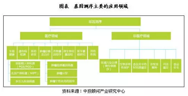 ![]() 中国基因检测行业发展特点 中投顾问发布的《2017-2021年中国基因检测行业投资分析及前景预测报告》表示,基因检测在我国的发展随着技术手段的进步正在越来越快速,其发展现状可以通过国内最大、最规范的几家基因公司的发展状况来反映。中国的基因公司数量众多,但实力强大的主流公司只有华大基因、贝瑞和康、安诺优达、达安基因(002030)、诺禾致源、百迈克、凡迪生物等,数量不超过十家。在1999年,基因产业又添新成员--华大基因公司,该公司的核心人物全部来自人类基因组的中国部分。目前员工数量超过5000人,最近几年公司的收入规模已经达到10亿元级别。该公司业务范围广泛,几乎囊括了其余公司的所有业务种类。而行业中其他各基因公司所涉及的业务范围都没有明显差异,他们主要靠的科技服务和医学服务的收入起家。华大基因公司业务涉及面广,主要包括无创产前基因检测、辅助生殖、单基因病、新生儿筛查、肿瘤个体化治疗、遗传性肿瘤筛查、心血管病筛查、血液病筛查等项目。无论从测序仪器还是人才储备来说,都是中国基因检测行业的老大。而同行中贝瑞和康的业务主要集中在无创产前基因检测技术和科技服务,很少涉及其他领域,在中国无创产前基因检测技术这个行业中只有华大基因的市场占有率高于贝瑞和康。 目前国内基因检测行业发展有如下特点: (一)推出了自己的测序仪,逐步打破了国外的垄断 世界测序仪市场很长时间是由Illumina和LifeTech这两家美国公司垄断的。2013年的测序仪市场份额的91%被这两家美国公司所占有。其中Illumina占比达到53%,LifeTech占比38%。而现在Illumina、LifeTech两家公司在市场上的的垄断情况正在被中国自己的测序仪逐步打破。美国基因检测仪公司CompleteGenomics(下称“CG”)于2013年3月被华大基因收购了。其中测序仪是由华大基因子公司华大制造负责生产制造,他们正在推出不同型号和不同用途的产品。目前基因检测设备的国产化问题已率先得到了解决,而且,该公司生产的基因检测设备比较便宜,价格仅仅是进口设备的1/3到1/6。目前测序仪全球分布的热点区主要在中国的深圳(主要是华大基因),南欧,西欧和美国。 华大基因测序仪BGISEQ-1000,BGISEQ-100已经上市,一定程度上削减了Illumina、LifeTech公司的份额。在国内,除华大基因外,诺禾致源公司也具备生产基因测序仪的资质。同时,也不乏有些公司合作生产适合中国市场的测序仪,其中就包括达安基因与LifeTech合作、贝瑞和康与Illumina合作等。这一系列举措使美国在国际测序仪市场上的垄断地位受到了来自中国的巨大挑战。 此外,国外公司对该产业上游包括的与基因测序相关试剂、耗材、软件等并没有形成垄断,国内厂家完全有实力生产其中的一些试剂、耗材。而与之相关的软件开发更是中国的强项。 (二)市场:从无创产前检测技术向肿瘤、心脑血管过渡 继无创产前测序竞争开展数年后,国内的多家基因公司开始进入肿瘤市场,除华大基因外,安诺优达、诺禾致源等体量较小的公司也开始布局肿瘤市场。目前中国市场上涉及肿瘤种类最为全面的肿瘤套餐正由华大医学推向市场,该套餐的目标客户既包括健康人群、高危人群,也可辅助治疗、预后监控。 安诺优达与华大医学不同,该公司不追求肿瘤覆盖种类,在发展初期,安诺优达专攻乳腺癌、卵巢癌等,因为这是女性易发肿瘤,并力求把这几种肿瘤的检测、解读做精、做细,从而形成差异化竞争。 诺禾致源甚至放弃了无创产前市场而将所有精力集中于肿瘤测序。在无创产前市场位居第二的贝瑞和康在2014年7月公布“无创单基因疾病检测方法”,涉及到肿瘤领域,只是称“该方法对肿瘤检测领域同样具有广阔的应用前景”但在肿瘤测序方面尚不明朗。上市公司达安基因则于2012年推出了“TM15检测”,该产品定位于早期筛查,并未涉及个体化治疗。随着基因测序技术的不断发展,下一个较为成熟的产品应该是心脑血管基因测序,现在人们的生活方式和生活节奏,心脑血管疾病患者数量成递增趋势,该疾病的致死致残率并不低于肿瘤,要想收到良好的效果做到提前预防、早期发现是很有必要的。猝死预测是心脑血管基因测序包括的诸多产品之一,但目前各公司都未披露具体项目。 国内各公司中,种类较多、技术较为成熟的还是属于华大基因的心脑血管基因测序产品。 以心源性猝死为例,在国内首屈一指的当属华大基因子公司华大医学,该公司可对5种与心源性猝死疾病相关的54个基因进行解读。 中国基因检测市场现实需求 (一)临床医疗是目前基因测序主要应用领域之一 中投顾问发布的《2017-2021年中国基因检测行业投资分析及前景预测报告》表示,基因测序目前可应用于医疗领域和非医疗领域。医疗领域的应用领域主要有生殖健康、遗传病检测、新药研发、肿瘤诊断及治疗、心血管疾病以及医学基础研究,其中生殖健康、肿瘤诊断及治疗、新药研发和医学基础研究是目前最主要的应用领域。基因测序在非医疗领域的应用主要有环境污染治理、生物多样性保护、食品及中药材同源鉴定、农牧业育种及司法鉴定等。 ![]() (二)生殖健康领域产品相对成熟,市场仍有较大发展空间 基因测序技术在生殖健康领域的应用可分为胚胎植入检查、产前检查和新生儿疾病筛查。基因测序技术在生殖健康领域的应用较