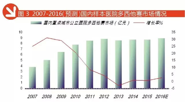 多西他赛: 觊觎老大地位日久 多西他赛属于微管解聚抑制剂(Docetaxel,多烯紫杉醇),属于紫杉烷类化合物,由法国罗纳普朗克·乐安公司最早研制开发,用于治疗晚期乳腺癌和非小细胞肺癌。在美国M.D.Anderson肿瘤中心进行的Ⅱ期临床试验发现,多西他赛对应用顺铂和卡铂失败的晚期卵巢癌患者有较好疗效。而且多西他赛对前列腺癌、胰腺癌、软组织肿瘤、头颈部癌、胃癌、食管癌等实体肿瘤均有显著活性。 多西他赛先后在美国、日本等80多个国家相继上市,1996年进入我国开始临床验证后上市。江苏恒瑞在国内已开发获准上市,目前恒瑞的多西他赛在医院的销售额已经超过进口药物,成为销量最大的商家。 据HDM系统数据,2016年1-3季度国内重点城市公立医院多西他赛销售金额达6.75亿元,预测2016年全年多西他赛用药金额达8.99亿元,同比上一年增长了2.79%,远高于同类品种。虽然目前多西他赛总销售额落后于紫杉醇,但是增速较快,赶超紫杉醇成为同类药中的老大指日可待。2016年国内重点城市公立医院多西他赛TOP 5生产厂商为:江苏恒瑞占据40.72%、赛诺菲占据29.74%、山东齐鲁占据15.56%、深圳万乐占据8.39%、奥赛康占据2.04%。