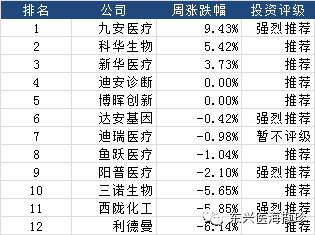 本月IVD行业指数样本中,九安医疗、科华生物和新华医疗分别位列涨幅榜前三位,而利德曼、西陇化工和阳普医疗则以超5%的跌幅位居倒数。基因诊断概念股千山药机和紫鑫药业上周的涨跌幅分别为-2.04%和0.97%。