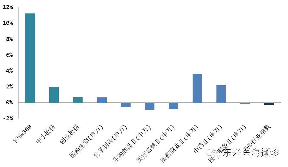 二级子行业方面,本周只有医药商业和中药涨跌幅为正,而IVD微跌。