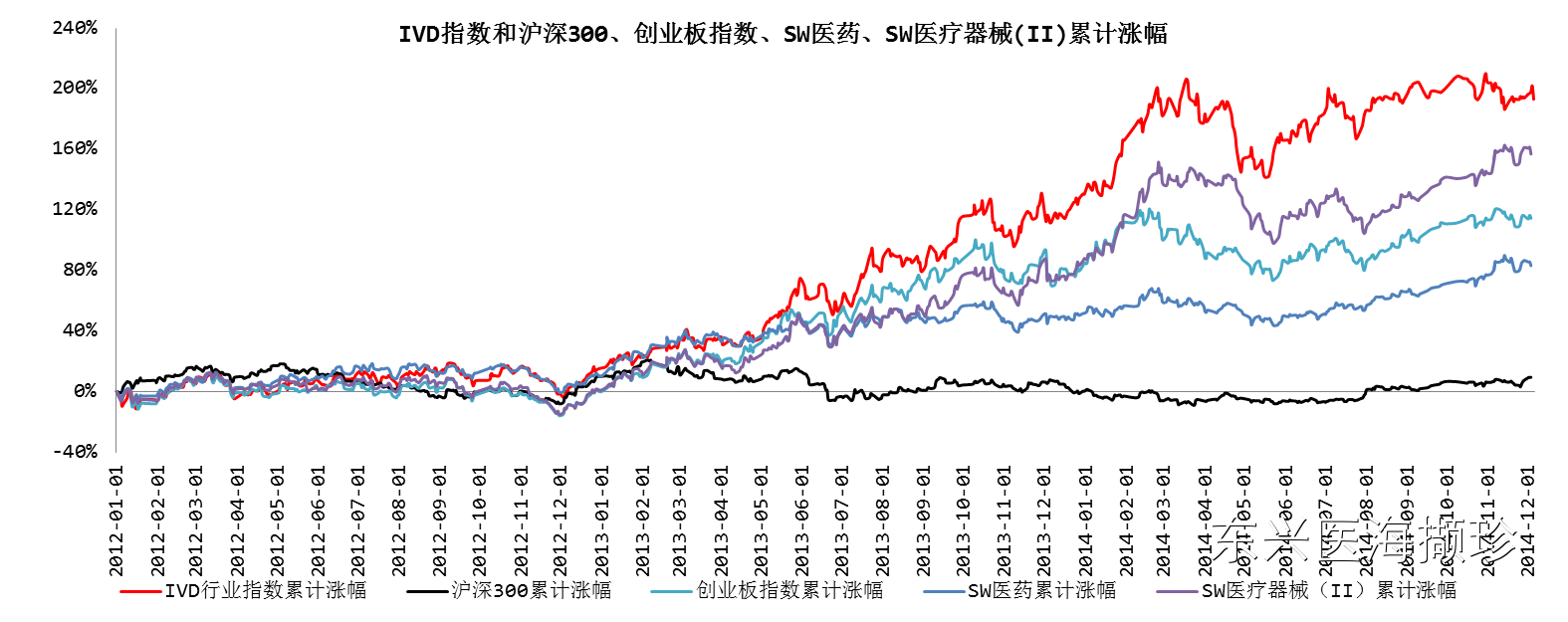 截至报告期收盘,IVD行业指数相对于原点的累计涨幅为193.01%,未能超过200%,同期沪深300指数累计上涨35.94%,创业板指数同期累计上涨123.72%;SW医药生物指数累计上涨86.60%,医疗器械板块累计涨幅为152.88%。