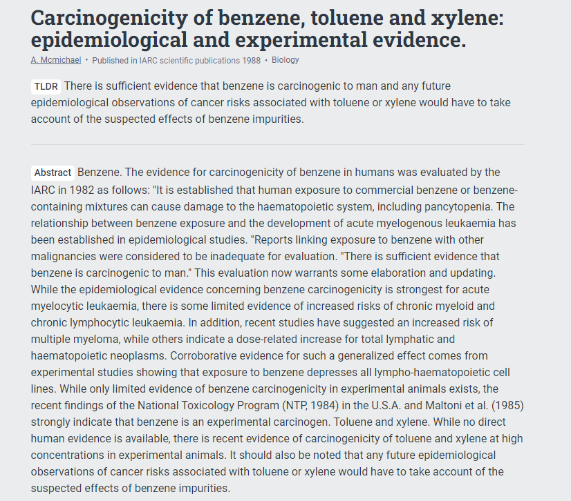1982年,世卫组织旗下的国际癌症研究机构(IARC)曾经发表过有关苯和相关化合物致癌性的专论,到1988年又补充了部分流行病学和实验证据,得出结论认为: