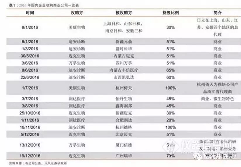 国内渠道加速整合,未来3年是重要窗口期,本质是客户资源的圈地 国内体外诊断公司,在登录资本市场后,主要并购方向集中在国内销售渠道和产品的并购。由于近几年两票制和营改增等对于渠道的管控加强,2015-2016年并购的热点主要集中在渠道的并购。国内体外诊断产品刚刚起步,短期内性能的差异化不显著,因此对于终端的把控决定了产品的销售。 因此在2015-2016年度,各大上市公司开始快速布局销售网络,通过并购渠道来瓜分市场份额。随着两票制政策的落地,渠道流通的大洗牌以前所未有的速度在推进。在药品两票制完善后,高值耗材和体外诊断将是下一个要整改的方向。未来体外诊断的配送将快速提高门槛,比如企业规模、销售品类、GSP资格认证等等都对企业的规范性有了新的要求。对于渠道自身来说,未来政策的不确定性也使得渠道和代理商倾向于背靠上市公司,用于回避未来政策的不确定性带来的风险。 注:以上不包含新设立子公司 渠道的收购在短期可以通过客户资源的划分,而快速提高市场份额,预计在2019年完成布局,格局初定,后续更需要关注的是如下几点: 1.产品地位:国内企业对于渠道的收购,无论进口代理还是国产代理都有布局,我们较为看好国产品牌的代理和进口一线品牌的代理。随着降价的压力和国产品牌性能提升,进口品牌竞争力逐渐下降,尤其是二线进口品牌,品牌效应不如一线外企,价格却依然高居不下,将是第一步被替代的产品。国产产品以传统优质品牌为主,利润空间大,产品性能满足临床要求,将成为增长最快的产品线。在格局稳定后,最终需要回归到医疗产品。并购渠道的企业须有清晰的未来布局,才能在下一轮竞技中脱颖而出,因此渠道的收购只是手段,产品才是公司长远发展的基石。 2.管理能力:并购渠道的厂家除了体外诊断行业内的公司,还有部分跨界企业,并购后的管理决定了企业的长远发展路径。由于体外诊断与药品、高值耗材的销售模式有较大差异,因此跨界并购将带来一系列管理问题。渠道间的整合,不同产品线之间的平衡,都将对是企业面对的巨大挑战。 3.盈利能力:在圈地运动结束后,盈利能力是最后的胜利。在圈地早期,为了竞争更多的客户资源,以拓展份额为主要目的,必然牺牲产品的利润来达到竞争的目的,格局稳定后,如果依然无法盈利,或者薄利,在降价政策不确定的环境下,面临巨大的风险。而盈利能力强的企业,依然有空间面对下一轮调整而获得重生。 注:以上包含新设立子公司 2016年行业内出现较为明显的特征,是行业并购渠道的步伐加快,以并购或者新设渠道的方式,旨在集采趋势下划分客户资源范围。其中润达、迈克、迪安、万孚、美康、塞力斯表现积极。截止到2016年底,国内通过收购或者与渠道核心人员成立新设子公司几乎已经覆盖全国大部分区域,预计在2年内格局初定。 产业的并购,中国企业小试牛刀,相较海外的巨头企业之间的合并,我们认为还有很久的路要走。企业的同质产品的合并,对行业而言,良性竞争能创造出更理性的大环境,企业也能在安静的环境中,以更笃定的心态继续研发出更多优秀的、低价的产品。 体外诊断行业高速增长,优质赛道筛选优质标的 体外诊断作为中国医疗器械中重要的分支,保持高速的增长,已经成为全球增速最快的区域,2016年中国区增速约为16%,而国产品牌增速已经超过进口品牌的增速以前国产的竞争对手主要是国产品牌,同质化的产品通过渠道和价格竞争,而今,越来越多的体外诊断国产品牌登录资本市场,资金、品牌、人才有了更强的竞争实力,产品性能的提升将以更高的加速度发展,欧美产品发展的长期历程,在中国会加速进展。同时由于政策偏好、医保控费等因素,进口品牌将逐步丢失守地。 随着分级诊疗的进程,诊断行业先行受益。在分级诊疗基层布局的阶段,行业的增长来源于下游的需求高速增长。优质的诊断上市公司将在这一轮行业洗牌中持续受益。