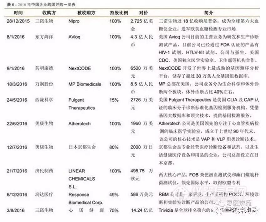 导读:纵观海外IVD巨头,经过一轮自由竞争,市场格局趋于稳定。在其细分领域发展到极致后,只靠内生增长发展速度有限,通过产业并购来注入竞争优势已经是习以为常的状态。企业的并购主要分为技术产品的并购和市场份额的并购。 作为医疗器械中的重要组成部分,体外诊断由于其独有的属性,使得越来越多的企业能够在A股登录,借助资本的力量以更快的速度发展壮大。在上市前,不同企业的竞争优势体现在产品、渠道、推广等等方面。上市后,除了企业自身的发展,企业的并购整合、战略方向的不同使得企业出现了分化,同时融资难度降低,并购则是上市后企业得以发展最主要的工具之一。根据并购的主体和标的不同可以大致分为三类:海外巨头的并购和合并、国内企业海外并购、国内企业国内并购。