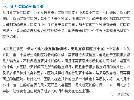 从2014年以来,互联网医疗得到了长足的发展,从健康管理到挂号预约,从医生问诊到线上购药,在互联网平台和创投资本的快速结合中,互联网医疗的服务体系正在全面完善,但是这种完善却似乎少了一个什么东西,这就是医检产业,对于医生而言,医检是医生判断患者病情的重要辅助,如果少了医检这一关键环节,真正想要把医疗实现互联网化将会变得异常困难。而医检,正在成为现在互联网医疗中的一片洼地,值得广泛的关注。 (图片来源:Digital Trends) 二、医检行业投资的意义在哪? 在仔细梳理患者就医链条的时候就会发现,在患者就医的过程中真正看医生的时间可能就只有短短的几分钟,但是患者大量的时间被化验给挤占了,整个过程耗时耗力,可以说是看病的重要痛点。与此同时,由于医院体系的信息不对称,大量的患者并不知道检查的注意事项和流程,医生需要耗费大量的时间去反复叮嘱患者的就医流程和化验情况,医检正在成为医疗产业的核心痛点。如果有企业能够真正切入医检行业,通过互联网化、移动互联网化的医检可以对整个产业的流程进行全面的优化。 一是对于医院实现医院就医的流程优化。通过互联网的平台,让需要直接化验的病人在见医生之前就进行必要的化验,从而把患者排队、医生开具化验单、叮嘱化验流程等时间完全节省下来。从而大大提升了医生看门诊的效率,并且在医院上班之初就实现了患者的分流,从而将整个医院运行效率进行了全方位的提升。 (图片来源:TheHealthSite) 二是对于患者实现时间的合理分配。对于患者而言,最大的希望就是用最小的成本实现最快治好疾病的目的,在成本中除了看病所需要支付的金钱成本之外,患者还将大量的时间成本耗费在看病的过程当中,而时间成本的大户就是化验问题。一般情况下,医院化验患者需要从多角度不同项目进行化验,并且不同化验项目对于患者的要求还都不一样,从而导至了流程的过度浪费,比如说,常见的抽血项目需要患者空腹,常见的激素测试项目需要患者在特殊的时间段内进行化验,这些往往是患者难以了解的。而却要经常为了这些项目排长队,浪费了过多的时间和金钱,如果有平台能够妥善帮助患者实现化验流程的全面优化,让患者拿着已经化验好的化验单直接去找医生,将会对就医带来质的改变。 三是进行提升医患沟通水平。在医疗行业很多时候都是由于信息不对称,导至了患者难以理解医生的所作所为,甚至恶意的认为医生是要通过多开化验项目,多开贵药实现赚患者钱的目的,从而让医患矛盾升级,而如果能够通过互联网平台实现对于化验等医学常识的普及,从而让医患的紧张关系得到真正的缓和。 医检行业相比于其他已经被过度开发的行业来说还是一个尚未开垦的处女地,对于医检行业的投资将会抢夺市场先发优势,实现对于投资的高效回报,值得重点关注。