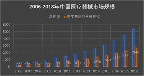 在2013年进口的医疗器械中,不需要售后服务的医疗器械有医用耗材占19%,医用敷料占12%,保健康复类的器械占22%,总和为53%,即需要售后服务的医疗器械占总额的47%。由此可见,这个大概的比例应该还是比较靠谱的。 因此我认为,在所有医疗器械中,大概有50%的医疗器械是需要售后的。根据这个比例,我估算出2006-2018年需要售后的医疗器械市场规模,制作成图表如下图所示: