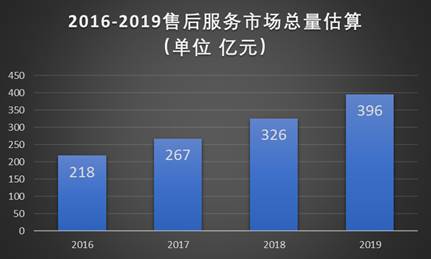 计算结果出炉,你意外吗? 有了上面的数据,是否就能间接的推算出来中国医疗器械售后服务市场的规模呢?这其中还缺乏一个关键的数据,就是平均来讲,售后服务的费用占医疗器械采购金额的百分比是多少? 这个也不是一个容易的事情,通常来讲,高端设备或者关键设备(比如说CT,MR)的售后费用占比比较高,而常用且价值低的设备(比如说血糖仪,血压仪之类)售后费用占比就会相当低,因此平均下来到底是多少,可能会跟这家医院医疗设备的构成有关系。 在这里我给出一个大家普遍认可的一个大概的平均数—3%,即如果一家医院的所有可维修的医疗器械的资产总和为100块的话,每年的维修费用就是3块钱。有的朋友会问,这个数字靠谱不?怎么得来的?我在这里就不展开了,感兴趣的朋友可以在网上搜一下《医疗设备维修成本分析和管理》以及《各类医疗设备维修保养费用现状分析》等相关的文章。 接下来我们来试着估算一下2016年的售后服务市场总量,大家需要了解,可以维修的这些医疗器械都是耐用品,通常来讲生命周期都有7-15年,我们取一个平均数,假设所有的医疗器械的寿命都是10年,因此在2016年的时候,2006年卖的机器还在使用,虽然马上要淘汰,但是还要维修,因此在2016年初,整个中国的可维修医疗器械的总量为2006年到2015年历年来销售的可维修医疗器械总量之和,即7283亿元。乘以3%就得出2016年初中国医疗设备的售后服务市场总量为218亿元。由此可以计算出2016年到2019年售后服务市场总量如下图:
