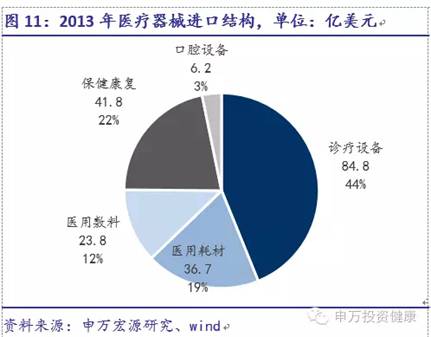 从上图看出,心血管科(12%),骨科(9%),整形手术(5%),创面处理(3%),糖尿病相关(3%),一般医用耗材(3%)这些都是以耗材为主,不需要维修售后;对于其他类别的医疗器械我们粗略估算有一半(8%)不需要维修。而在IVD行业比较特殊,通常试剂跟仪器的销售占比约为3:1,因此粗略估算IVD行业中不需要售后服务部分的占10%。 上述百分比加起来为53%,即有47%的医疗器械是需要维修售后的。这个估算到底准确度有多高呢?为了验证这个比例,我找到了来自申万投资健康微信公众号的一个数据,说2013年医疗器械进口结构中如下图所示: