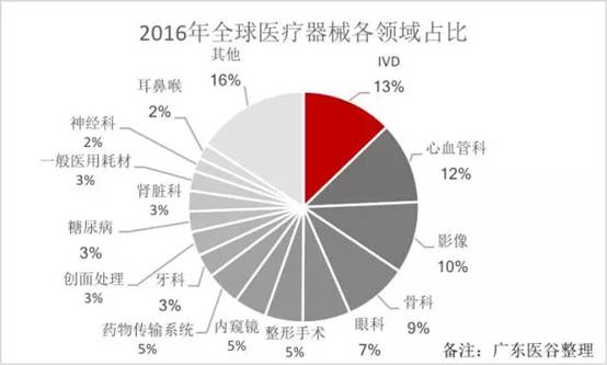 来源:http://www.chyxx.com/industry/201708/550151.html 我们知道,医疗器械按照最新的分类标准有44个分类,并不是所有的医疗器械都需要维修的,比如说很多医用高值或低值的耗材,医用敷料,部分的保健康复类的医疗器械也不需要维修,需要维修的主要是诊疗设备,比如说CT, MR,核医学,超声,心电监护仪,放疗设备等等。 那么这些需要维修的医疗设备占所有医疗设备的比例是多少呢?援引广东医谷赖志城先生整理的由Evaluate MedTech发布的《2017年全球医械市场概况以及2022年全球医械市场预测》一文中的数据全球医疗器械占比图如下: