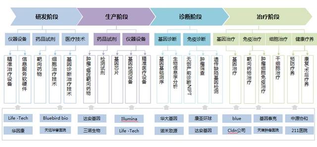 ![]() 前言: 精准医疗(精准医学)是以个体化医疗为基础、随着基因组测序技术快速进步以及生物信息与大数据科学的交叉应用而发展起来的一种新型医学概念与医疗模式。精准医疗代表着医疗健康产业的未来发展方向,从研发、预防、诊断和治疗等方面颠覆了传统医学体系。东滩顾问长期关注精准医疗产业发展,本文对精准医疗产业做了一个较系统的整理,分为"精准医疗的兴起、精准医疗颠覆了什么、精准医疗的产业发展逻辑、精准医疗的产业链创新体系"四个篇章。 一、精准医疗的兴起 二、精准医疗颠覆了什么 三、精准医疗的产业发展逻辑 四、精准医疗的产业链创新体系 精准医疗(Precision Medicine)是以个体化医疗为基础、随着基因组测序技术快速进步以及生物信息与大数据科学的交叉应用而发展起来的一种新型医学概念与医疗模式。简而言之,就是通过对正常人和病例个体的基因测序,对比分析患病情况,针对性利用靶向药物、细胞疗法等治疗手段,精准地对病毒或基因进行打击治疗,从而安全、高效地精准治愈疾病。2015年,美国总统奥巴马在国情咨文演讲中启动精准医疗计划,一期投入2.15亿美元,是希望招募100万名志愿者进行基因组测序,从而拉开了全球声势浩大的精准医疗发展大潮的序幕。 目前,全球生物医药领先的美国、日本、澳大利亚、韩国、英国、法国等国家纷纷布局精准医疗产业,中国也将精准医疗纳入十三五重大科技专项,到2030年拟投资600亿元;同时,产业资本、药企巨头、保险巨头、科技巨头也纷纷以股权投资等各种形式参与精准医疗企业的投资布局,如松禾资本、软银中国、Google、IBM、微软、泰康资产、平安创投、复星医药、三胞集团、罗氏等,以至于目前精准医疗市场规模近600亿美元,2015-2020年期间预计增速可达15%,是医药行业增速的3-4倍;而且随着人类坏境和生活方式的改变,全球重大疾病、亚健康和慢病人群基数庞大,且逐年增长,未来精准医疗的市场客群和服务需求量及其庞大,这也是精准医疗产业被市场广泛看好的另一个有力因素,精准医疗未来的市场潜力确实不容小觑。 ![]() 传统医疗痛点催生精准医疗。传统医疗是在结合临床医生的个人实践经验和客观的科学研究证据,对症状相同的病人使用相同剂量的同种药物进行治疗,但治疗效果千差万别。相关数据显示,运用传统医疗方案,治愈肿瘤的无效率高达75%,治愈糖尿症的无效率为43%。由此可知,传统医疗在治疗重大疾病面前依然束手无策。随着科学的发展和技术的进步,人们也逐步意识到大多数疾病的发生是自身遗传密码和外部环境共同作用的结果。 传统医疗导至用药无效率精准医疗正是在这样的背景下应运而生,充分借助可监测的遗传信息和环境信息,针对个体提供定制的优化治疗方案,提升现有治疗水平,并能在病发之前就有望有效预防。 精准医疗具有定量化、个性化、事前预防和连续性四大特点,是对传统医疗的重要革新,进一步解决了传统医疗的痛点,避免医生由于"只见森林不见树木"导至过度依赖主观经验、描述和循证医学的大众数据,造成对个体的诊疗有效率低、副作用大、事后举措仓促等问题。精准医疗一方面可以提升医疗效率,另一方面还可以降低不合理医疗造成的高昂费用,具有广泛的社会效益。 精准医疗是对传统医疗的颠覆1、诊断:基因测序技术实现精准诊断 从人类发现DNA的双螺旋结构,第一次窥探到生命体如何继承和存储生物信息,到"人类基因组计划"宣布完成,再到高通量测序技术的出现,正逐渐开启"个人基因组"的时代。个人基因组学是实现"精准医疗"的一把利器,而精准医疗的基础便是完成人类的基因组测序。基因测序技术凭借灵敏度高、精度和通量高、价格低廉等优势,成为基因检测技术中获取人体基因组数据的主流技术。 以肿瘤为例,每个肿瘤都有自己的基因图谱。精准医疗就是要借助基因测序技术,准确找到每一位病患的基因变异信息,从而选择恰如其分的治疗方式。肿瘤领域的基因测序是精准医疗最重要的组成部分,其应用将覆盖肿瘤的易感基因检测、早期筛查、疾病确诊、个性化用药指导、随诊与疗效评价等众多治疗环节。2、治疗:靶向用药实现精准治疗 传统药物治疗对待病人都是对症下药,千篇一律;精准医疗则以大数据分析结果为依据,将病患的内在基因和外在环境结合,为其定制个性化治疗方案,实现靶向用药。 以肿瘤为例,传统肿瘤治疗主要有手术、放疗及化疗三种治疗方式,治疗过程往往既折磨病患身体又折磨病患心理;精准治疗则可以依靠基因测序等技术,有效识别肿瘤细胞与正常细胞之间的差别,有针对性地杀死肿瘤细胞及驱动其生长的细胞群,同时对正常细胞的危害降到最低点。既能通过检测肿瘤靶向药物靶点,实行分子靶向用药,提高用药效率;又能通过临床肿瘤基因组学的研究,筛选并发现不同患者对同种药物治疗存在个体差异的遗传指标,并依据指标实现临床上的差异化用药,提高药物治疗的安全性,进而实现个性化治疗。3、预防:大数据实现精准预防 在医学领域,大数据能使医疗保健及疾病预防更为个性化和精准化,美国加州Scripps Health Centre首席学术专家Eric Topol曾称:医学中的数字化已经势不可挡,数字化与医学的交汇已经不可避免,变革已经在这一交汇的舞台上初见端倪。在推进精准医疗实施的过程中,