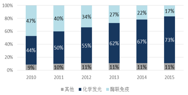 01 ♪ 免疫诊断技术简介 免疫诊断是指应用免疫学的理论、技术和方法诊断各种疾病和测定免疫状态,主要用于肝炎检测、性病检测、肿瘤检测、孕检等病毒检测,此外,还应用于法医学的血迹鉴定、生物化学的血清成分鉴定和物种进化关系的研究等。 免疫诊断是确定疾病的病因和病变部位,或是确定机体免疫状态是否正常的重要方法,可在体内和体外进行。免疫诊断技术是应用以免疫学为基础,利用抗原与抗体互相结合的特异性反应来进行定性或者定量的诊断。先后经历了荧光免疫、放射性免疫、酶联免疫、时间分辨荧光法和化学发光免疫阶段。 图表1:免疫诊断技术主要历史进程 目前免疫诊断的主流技术是酶联免疫吸附测定法和化学发光免疫分析,其中后者逐步在取代前者。化学发光技术因为其操纵简便、仪器自动化、特异性和灵敏度高等优点被国内三级医院特别是三甲医院广泛采用,而酶联免疫诊断在二级以下医院占有一定的市场份额。未来化学发光将向三级以下医院延伸,市场空间较大。 化学发光免疫分析技术是将具有高灵敏度的化学发光测定技术与高特异性的免疫反应相结合,用于各种抗原、半抗原、抗体、激素、酶、脂肪酸、维生素和药物等的检测分析技术,涉及的检测项目范围广,主要检测项目包含:肿瘤标志物、性激素、甲状腺功能、糖尿病、心肌、炎症、肝纤维化、传染病等。 图表2:化学发光主要检测项目 数据来源:新产业招股说明书 02 ♪ 化学发光诊断及其所在行业的发展情况 目前免疫诊断是我国体外诊断(IVD)行业的主流技术。2015年我国免疫诊断市场规模占整个IVD市场规模的30%左右,是IVD细分行业生化诊断、免疫诊断、分子诊断中市占率最高的。2010年我国免疫诊断市场规模约为45亿元,2015年规模达到95亿元,增速达到19%左右。2010年至2015年,年均复合增长率为16.1%。 图表3:我国免疫诊断产品市场规模(亿元) 数据来源:东兴证券研究所 化学发光诊断发展迅速已基本占领全球免疫诊断行业。在欧美国家,化学发光诊断技术已成为主流技术,占免疫诊断市场90%以上的市场份额。近几年,我国化学发光诊断发展迅速正逐步替代酶联免疫诊断,目前国内三甲医院已基本完成替代,大量的二级及以下医院形成较大的替换市场。2015年我国化学发光诊断规模占免疫诊断市场的73%。 图表4:我国免疫诊断细分市场格局及趋势 数据来源:东兴证券研究所 近几年我国化学发光诊断快速增长。我国化学发光市场规模从2010年的20亿元左右增长到2015年的69.35亿元,年均复合增长率为28%。 图表5:我国化学发光诊断的市场规模(亿元) 数据来源:东兴证券研究所 我国化学发光市场基本被外资企业占领,未来进口替代空间巨大。我国化学发光诊断90%的市场被外资企业罗氏、雅培、西门子、贝克曼占领,尤其是国内三甲医院等高端市场。由于化学发光技术壁垒高,国内企业具有技术实力的企业不多,最具代表的是新产业、安图生物(603658.SH)、迈克生物(300463.SZ)。2011年新产业推出第一台全自动化学发光仪,代表着国产发光公司加入市场竞争,目前国产约占10%市场份额,进口替代空间巨大。 图表6:我国化学发光市场结构 数据来源:顺策斯多克研究 国内企业进口替代若符合预期,5年内可占有近一半的市场份额。目前国内主要企业已基本突破技术壁垒,进入销售放量阶段,行业市场规模接近200亿,未来几年化学发光行业若仍保持25%-30%的增速增长,预计2021年行业总规模可达到400亿,参考生化诊断5年内占有了50%-66%的市场份额的进口替代的节奏,预计2021年化学发光诊断国内企业可占有100亿以上的市场份额。 图表8:化学发光进口替代市占额预测(亿元) 数据来源:兴业证券研究所 封闭式系统决定化学发光行业现阶段“仪器带动试剂”的经营模式。我国化学发光仪器已基本实现自动化操作,化学发光仪器不同于生化诊断仪器,检测系统是封闭式系统(指厂家生产的仪器只能使用其配套的试剂),因为其技术壁垒高,为保证检测的准确性和稳定性,未来系统开放的可能性不高,这决定了生产商“仪器带动试剂”的经营模式,促使生产商重视对仪器的研发投入。因此生产商每年的仪器投放量至关重要,基本能反应出盈利能力以及渠道开发能力。 行业发展的方向应是“进口替代+行业整合”。目前国内该行业企业分散,掌握核心技术的企业较少,行业发展方向应是“进口替代+行业整合”。同时,我国化学发光技术与外资企业相比主要存在精准度和稳定性较差,为实现进口替代需要国内企业加大研发能力,扩大检测项目范围,简化仪器操作、提高精准度和稳定性等,并借助价格优势以及特殊项目竞争三甲医院等高端市场,通过自身渠道实力和并购不断向三甲以下医院延伸。 另外,仪器检测高速性和一体性也是未来的发展趋势,一体性指的是不同检测仪器能够连接成全自动流水线,一个样本能通过流水线进行生化检测、免疫检测以及分子检测等,整个检测过程减少人工接触样本的环节,使检测结果更加精准、快速。因此拥有较强研发能力、规模优势、产品质量好和营销能力突出的企业将成为行业的佼佼者。 图表9:一体化的检测仪器 数据来源:网上公开信息 03 ♪ 国内化学发光诊断主要企业情况 国内化学发光诊断市占率较大的企业是新产业、安图生物、迈克生物。其中新产业是专注做化学发光的企