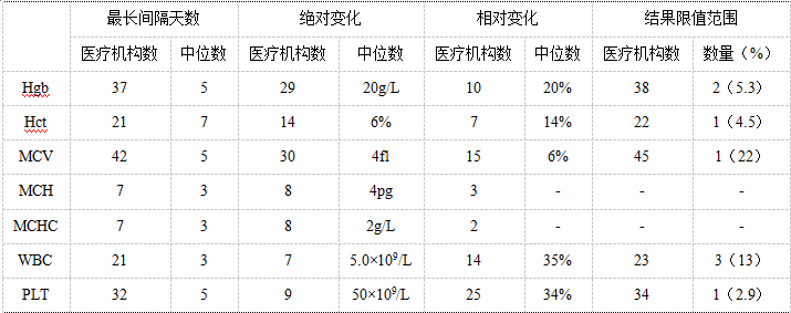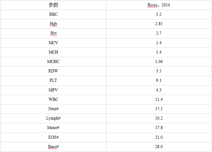 表1 常用血液学实验室质控规则 过去常有血液学实验室使用已分析过的患者标本在4~24h后重新分析作为第二种质控方法。现在多不建议使用,因为患者标本的稳定性比质控品差,且很难定义患者标本的靶值范围。 2.基于生物学变异的质控规则选择。几乎每个定量检验项目都受患者检验前因素影响,如疲劳(跑几层楼梯)会使血细胞压积(Hct)增高,或与坐位或卧位相比,患者站立后立刻采血会使Hct增高。为减少这些影响,获得最可重复的、可比的检验结果,诊断性血液标本采集应在标准状态下进行。即使严格遵守上述推荐,患者某些检验项目还存在非分析性变异。这些个体内生物学变异,在个体与个体间是相对恒定的,测量个体内生物学变异涉及健康个体的规范采样,并立即稳定血浆。最后,在同一批内分析这些标本,减少批间变异。 因全血不稳定,为了评估血液检验项目的生物学变异,在分析全血标本时,应采用定时方式检测新鲜血液标本。表2为CBC项目的个体内生物学变异估计值。如Hct个体内生物学变异中位数是±2.7%,该统计学结果可能为,约95%个体Hct范围为患者Hct均值±2×2.7%,约99%个体Hct范围为患者Hct均值±3×2.7%。为了判断患者当前Hct与最初Hct结果有无显著差异,Hct的增加/减低量就应较最初Hct结果大/小8.1%。