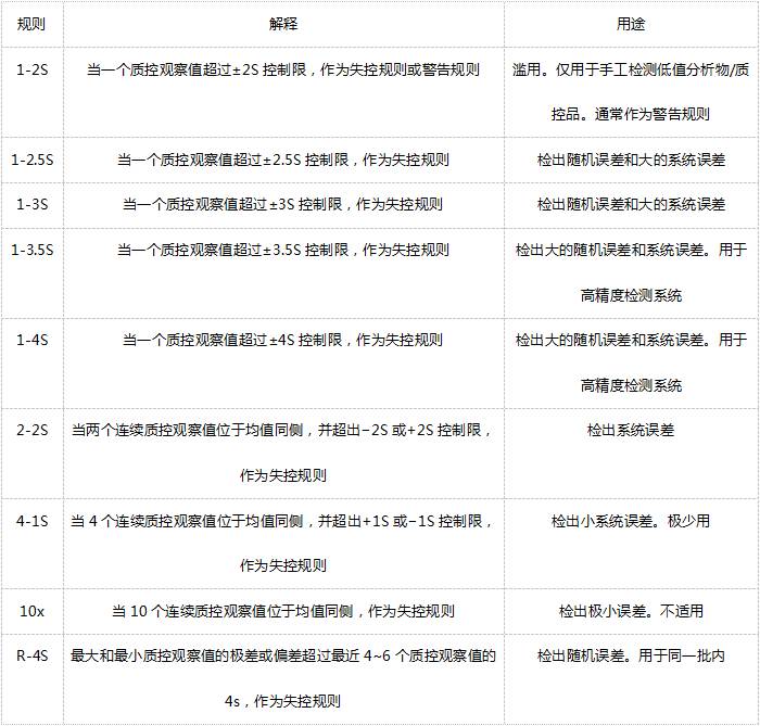 本期嘉宾 上海中医药大学附属龙华医院 胡晓波 上海电力医院 金大鸣 现今的血液分析仪与数十年前相比,已能提供高度可重复的结果,迫使我们要改变血液分析仪质量管理的观念。仪器性能的提高让我们能用简单的质控规则来管理设备。同时,也可减少危急值标本的重复检测。患者均值的部分质控技术已过时,需用更复杂的计算方法来预测离群值群体的截断值。已有的同组质控数据(peer quality control values)比较有助于改进仪器精密度和准确度,简化仪器的确认和校准。 室内质控(IQC)是实验室内部评价分析系统质量的方法。该方法是定期测定质控标本(或参考标本)。在血液学实验室中,厂商通常能提供30~90天有效期的2个或3个水平质控品。厂商靶值和限定范围很宽,不能作为实验室控制限。对每个新批号质控品,临床实验室应重新确认或修正新批号均值±标准差倍数,作为自己实验室可接受的控制限。实验室用同一仪器反复测定质控品能用于仪器精密度的评价。 室间质评(EQA)或能力验证(PT)是评估仪器准确度的方法,证明实验室仪器/试剂组合所生成的检验结果与能力验证试验提供者靶值的接近程度。由EQA/PT组织者在双月或更长时间间隔发送标本到实验室,结果回报后由EQA/PT组织者收集,并与其他使用相同仪器/试剂组合的参加者进行比较。可能在开始EQA/PT实验的数天或数周后,待所有参加者递交结果后才可进行比较。 本文主要介绍George S Cembrowski观点。Cembrowski先后获得哲学博士和医学博士,是加拿大艾伯塔大学医学和口腔学院检验和病理学系副教授,艾伯塔大学附属医院医学生物化学科主任,是CDC和CAP专家委员会委员,是许多体外诊断公司和FDA顾问,是美国和加拿大临床实验室质量管理和应用的著名专家。考虑到我国的现状,介绍的部分内容仅供参考。 一、室内质控现状和问题 1.用质控品做室内质控现状。在医疗机构临床实验室内,通常每天分析质控品2~3次。在受委托实验室内,需每批患者标本都做质控,通常在开始和结束运行患者标本时进行。在质控图上显示质控结果并采用1条或多条质控规则来判断。常用质控规则分类见表1,这些规则常用于解释质控结果,并将分析批分为在控、失控或警告。每条质控规则有其特定的误差检出能力,有的质控规则对系统误差(漂移)敏感,有的质控规则对随机误差(不精密度增大)敏感。由于血液质控品可用于16个或更多个全血细胞计数(CBC)参数的分析,过于狭窄的限值(如±2S、±2.5S,甚至±3S)能导至“失控”频率太高,而误分类在控的分析批结果。