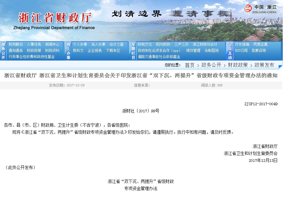 浙江省的医改工作一向被认为是“干在实处,走在前列”。 作者 | 子不语 来源 | "医学界"微信号 作为全国第一个在全省范围内全面破除以药补医的省份,浙江医改一直备受关注。而作为浙江医改的三部曲之一,“双下沉、两提升”长效机制近日再获新政。 近日,浙江省财政厅、省卫生计生委印发《浙江省“双下沉、两提升”省级财政专项资金管理办法》(以下简称《办法》),省财政将设立“双下沉、两提升”省级财政专项资金(以下简称“双下沉专项资金”),用于支持全省城市三甲医院优质医疗资源下沉和提升各级医院医疗卫生服务能力。此做法,在全国范围内尚属首例。 “双下沉、两提升”指优质医疗资源下沉和医务人员下基层,提升县域医疗卫生服务能力和群众就医满意度。据浙江省卫计委透露,双下沉专项资金总额接近3亿元。
