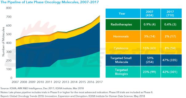 3、治疗创新管线及临床试验 2017年,制药行业管线中处于后期临床开发阶段的抗癌药物分子超过700个,创造了历史水平,比十年前增长了60%以上。