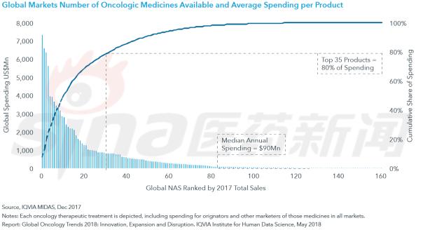 癌症药物的支出主要集中在少数药物上,销量排名前35的药物约占总支出的80%,超过一半的癌症药物年销售额不足9000万美元。在过去10年来,新推出的癌症药物价格稳步上升。例如,美国2017年上市的癌症药物中位年治疗成本超过15万美元,相比之下,2013年新上市的癌症药物的中位年治疗成本仅为7.5万美元。大多数癌症药物(包括年治疗成本较高的药物)被相对较少的患者群体使用;据估计,在2017年,有87%的肿瘤学药物治疗的患者人数少于10000例。 癌症支持性护理支出在近5年内几乎没有变化,2013年为237亿美元,2017年为236亿美元。目前,支持性护理支出约占全球支出的18%,低于2013年的25%,尽管创新疗法数量和支持性护理药物的市场容量逐年增加,但生物仿制药和小分子药物专利到期降低了支持性护理支出。