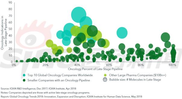 当前,有超过700家制药公司活跃在后期肿瘤学研发领域。总销售额超过100亿美元的大型制药公司对肿瘤学的关注具有高度的一致性,排名前14的大型制药公司研发管线中肿瘤学资产占比接近40%。许多单纯专注于肿瘤学的小公司,其命运最终可能是管线资产或整个公司被收购。但有越来越多的小公司正努力尝试在没有其他制药公司的帮助下独立商业化其创新产品。