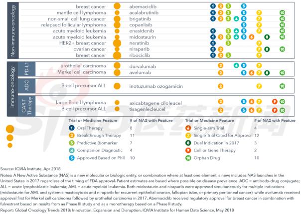 仅2017年就有14种新的活性物质(NAS)抗癌药上市,所有均为靶向疗法,其中11个获得了美国FDA的突破性药物资格,这些药物代表了显著的临床进步,并促进了横跨一系列肿瘤和机制中患者的总体生存。14种NAS中,6种是生物制剂(包括2种CAR-T疗法),7种与预测性生物标志物相关。 精准医疗对癌症治疗有重大影响,因为通过预测性生物标志物可将患者分层成特定的组,从而识别出有更大机会对治疗药物作出反应的患者群体。新的癌症药越来越多地应用于更小的患者群体,14个NAS中有10个针对的是罕见的适应症。