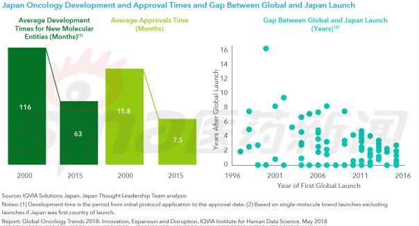 目前,各国都已采取了多种措施来加速癌症药物的开发速度,2017年批准的新药,从药物分子专利申请到药物批准上市的中位时间跨度为14年,略快于前5年。特别是在新药上市方面存在重大延误的国家——日本,在过去10年实施的政府举措已使新分子的平均开发时间和监管批准时间都缩减了一半。