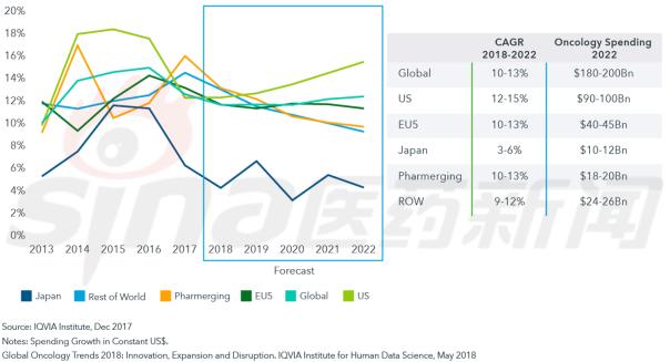 欧洲5国市场预计将经历较为缓慢的增长,原因是预算压力和卫生技术评估的更广泛使用限制了癌症药物的支出。日本肿瘤学支出预计也将放缓,这是由于该国价格控制机制的实施、对定价规则的进一步改革,以解决多适应症癌症产品的复杂性。 |